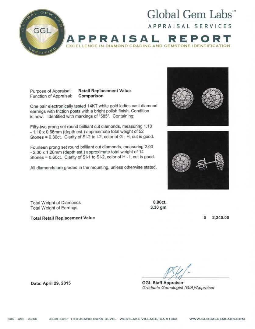 One pair electronically tested 14KT white gold ladies cast diamond earrings with friction posts with a bright polish finish. Identified with markings of "585". Condition is new. Containing: Fifty-two prong set round brilliant cut diamonds, measuring 1.10 - 1.10 x 0.66mm (depth est.) approximate total weight of 52 Stones = 0.30ct. Clarity: SI-2 to I-2. Color: G - H, Cut is Good. Fourteen prong set round brilliant cut diamonds, measuring 2.00 - 2.00 x 1.20mm (depth est.) approximate total weight of 14 Stones = 0.60ct. Clarity of SI-1 to S1-2, color of H - I, cut is good. All diamonds are graded in the mounting, unless otherwise stated. Total Weight of Diamonds 0.90ct. Total Weight of Earrings 3.30 grams. GGL Appraised at $2,340.00.