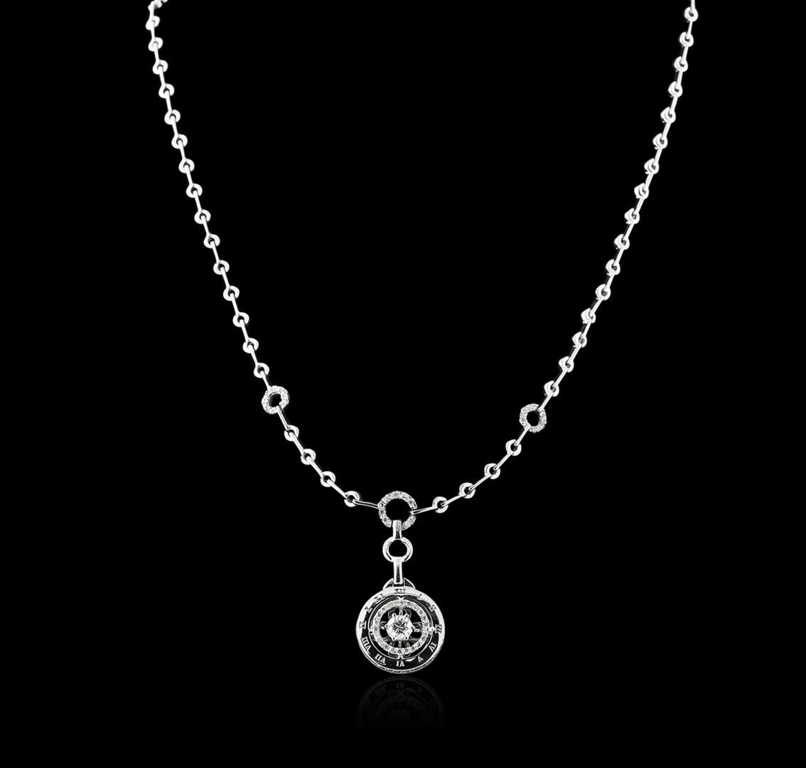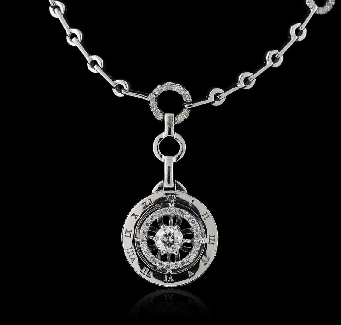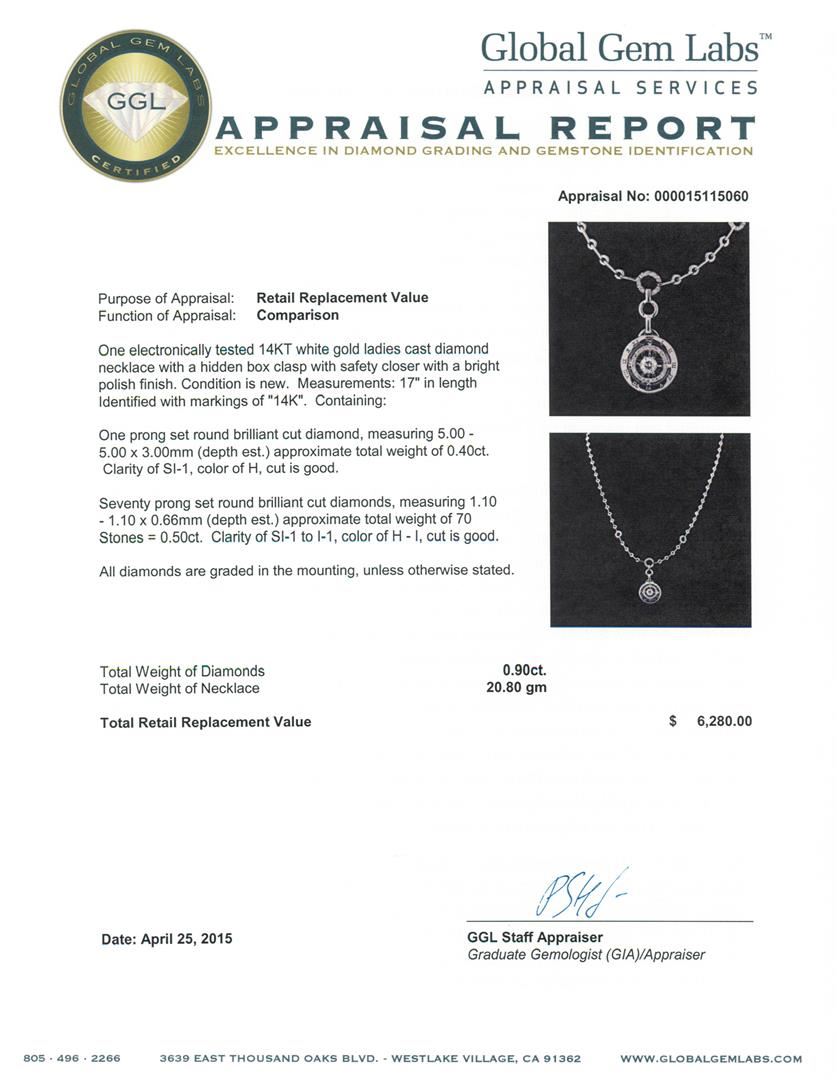 One electronically tested 14KT white gold ladies cast diamond necklace with a hidden box clasp with safety closer with a bright polish finish. Measurements: 17" in length Identified with markings of "14K". Condition is new. Containing: One prong set round brilliant cut diamond, measuring 5.00 - 5.00 x 3.00mm (depth est.) approximate total weight of 0.40ct. Clarity: SI-1. Color: H, Cut is Good. Seventy prong set round brilliant cut diamonds, measuring 1.10 - 1.10 x 0.66mm (depth est.) approximate total weight of 70 Stones = 0.50ct. Clarity: SI-1 to I-1. Color: H - I, Cut is Good. All diamonds are graded in the mounting, unless otherwise stated. Total Weight of Diamonds 0.90ct. Total Weight of Necklace 20.80 grams. GGL Appraised at $6,280.00.