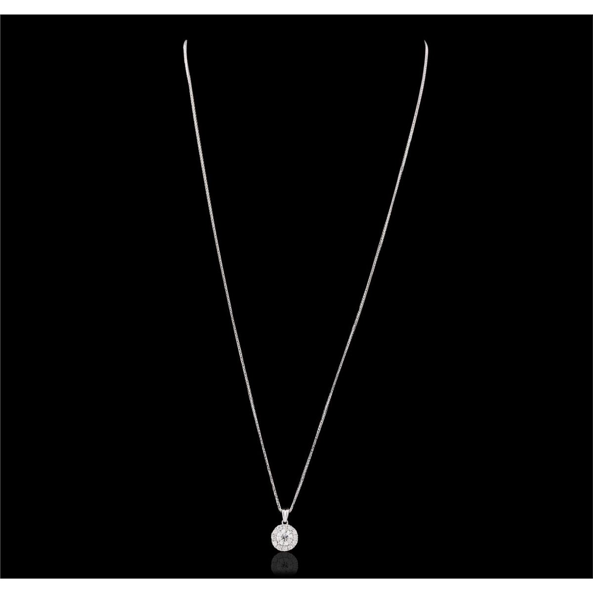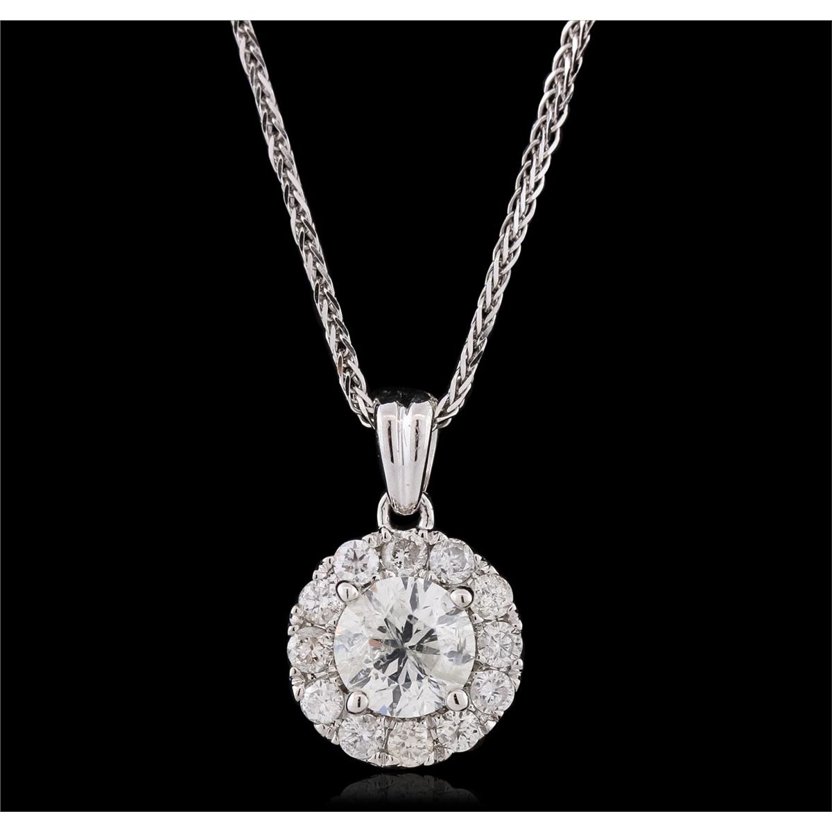 One electronically tested 14KT white gold ladies combination cast & assembled diamond pendant & chain 18.0" long, medium fancy cable with a lobster claw clasp with a bright polish finish. Identified with markings of "14K". Condition is new. Containing: One prong set round brilliant cut diamond, measuring 5.43 - 5.41 x 3.59mm (depth est.) approximate weight of 0.64ct. Clarity: I-2. Color: J, Cut is Good. Twelve prong set round brilliant cut diamonds, measuring 1.80 - 1.80 x 1.08mm (depth est.) approximate total weight of 12 Stones = 0.26ct. Clarity: SI-2 to I-2. Color: H - J, Cut is Good. All diamonds are graded in the mounting, unless otherwise stated. Total Weight of Diamonds 0.90ct. Total Weight of Pendant & Chain 2.70 grams. GGL Appraised at $3,895.00.