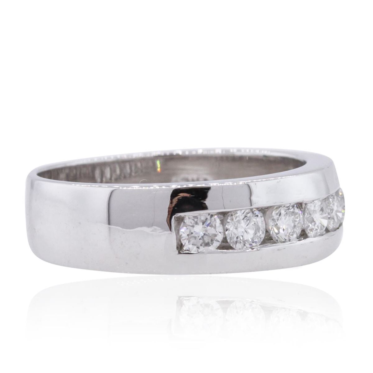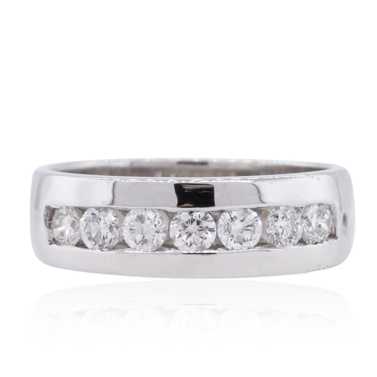 One electronically tested 14KT white gold gents cast diamond ring with a bright polish finish. The ring features a diamond set curvature, completed by a five and one-half millimeter wide band. Identified with markings of 14K. Condition is new, good workmanship. Containing: Seven channel set round brilliant cut diamonds, measuring 3.20 - 3.10 x 1.89mm (depth est.) approximate total weight of 7 Stones = 0.90ct. Graded in the setting. Clarity: SI-2 to I-1. Color: G - I. Total Weight of Diamonds 0.90ct. Total Weight of Ring 7.50 grams. AIG Appraised at $3,995.00.