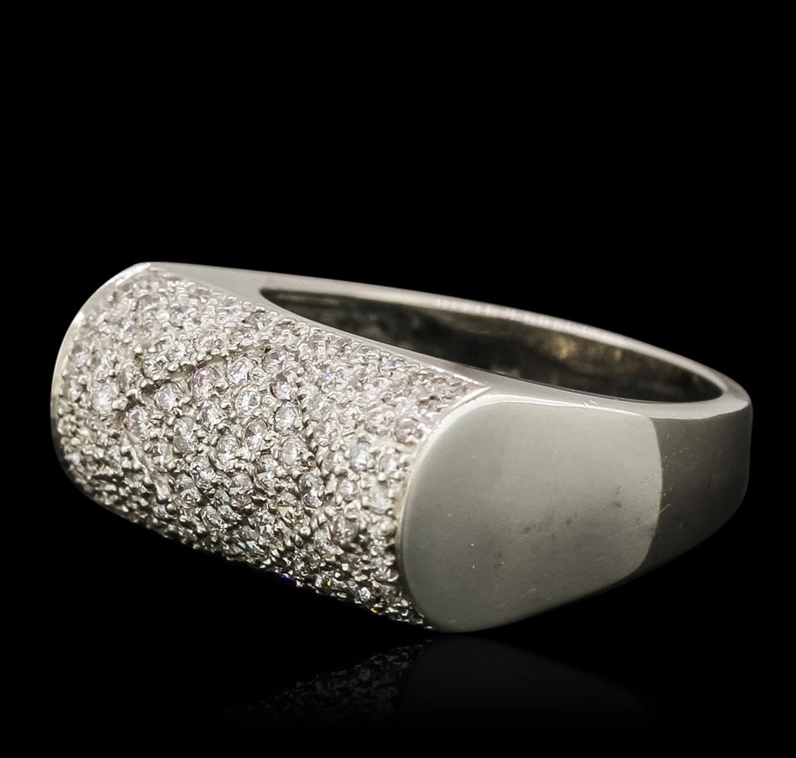 One electronically tested 14KT white gold ladies cast diamond ring with a bright polish finish. The ring features a stylized diamond set barrel shaped curvature, completed by a two and one-half millimeter wide band. Identified with markings of "14K". Condition is new, good workmanship. Containing: One Hundred Nine bead set round brilliant cut diamonds, measuring 1.30 - 1.20 x 0.75mm (depth est.) approximate. Total Weight of 109 Stones = 0.90ct. Graded in the setting. Clarity: VS-2 to SI-2. Color: G - I. Total Weight of Diamonds 0.90ct. Total Weight of Ring 5.38gm. AIG Appraised at $4,575.00.