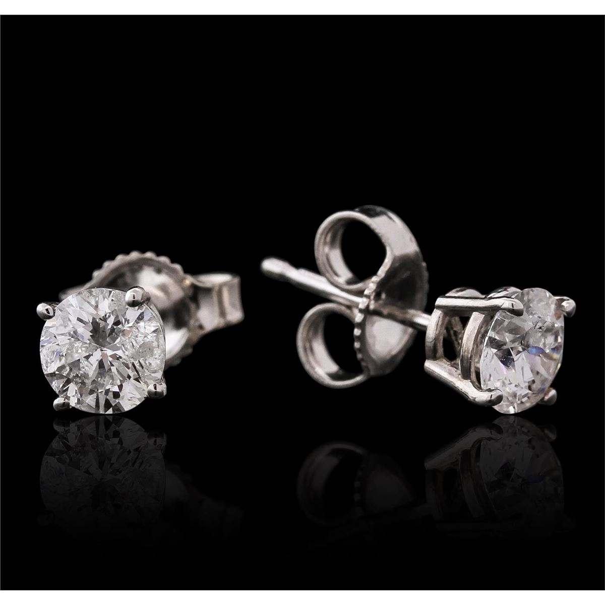 One pair electronically tested 14KT white gold cast & assembled diamond solitaire earrings with standard backs. Condition is new, good workmanship. Containing: One prong set round brilliant cut diamond, measuring 4.95 - 4.92 x 3.00mm (depth est.) approximate weight of 0.45ct. Graded in the setting. Clarity: I-2. Color: I. Depth 60.7%. Table 55.1%. One prong set round brilliant cut diamond, measuring 5.00 - 5.00 x 2.92mm (depth est.) approximate weight of 0.45ct. Graded in the setting. Clarity: I-2. Color: I. Depth 58.4%. Table 60.0%. Total Weight of Diamonds 0.90ct. Total Weight of Earrings 0.94 grams. AIG Appraised at $2,300.00.