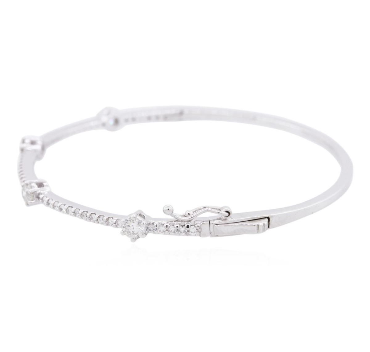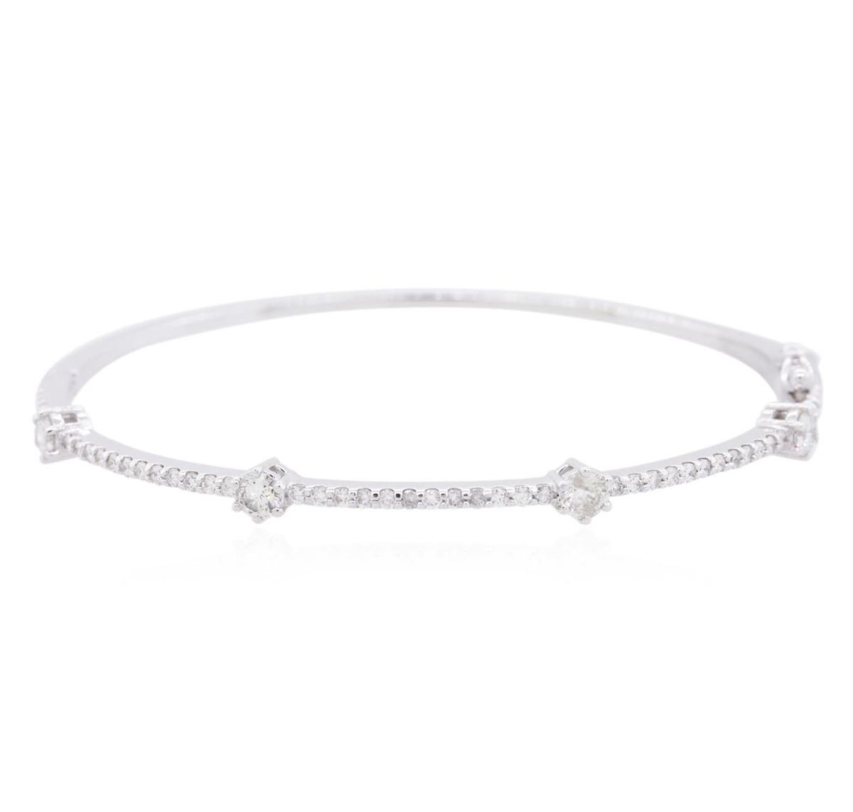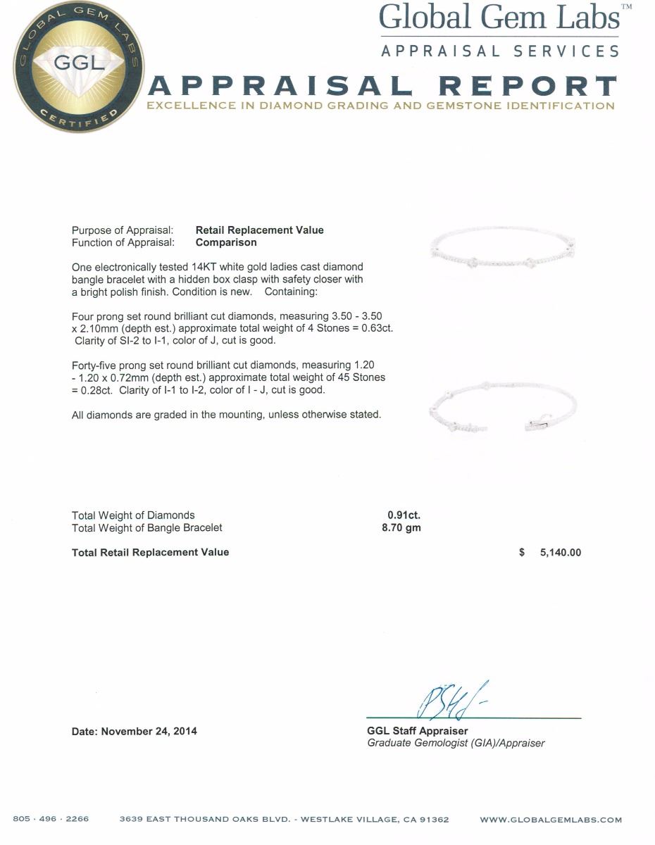 One electronically tested 14KT white gold ladies cast diamond bangle bracelet with a hidden box clasp with safety closer with a bright polish finish. Condition is new. Containing: Four prong set round brilliant cut diamonds, measuring 3.50 - 3.50 x 2.10mm (depth est.) approximate total weight of 4 Stones = 0.63ct. Clarity: SI-2 to I-1. Color: J, Cut is Good. Forty-Five prong set round brilliant cut diamonds, measuring 1.20 - 1.20 x 0.72mm (depth est.) approximate total weight of 45 Stones = 0.28ct. Clarity: I-1 to I-2. Color: I - J, Cut is Good. All diamonds are graded in the mounting, unless otherwise stated. Total Weight of Diamonds 0.91ct. Total Weight of Bangle Bracelet 8.70 grams. GGL Appraised at $5,140.00.