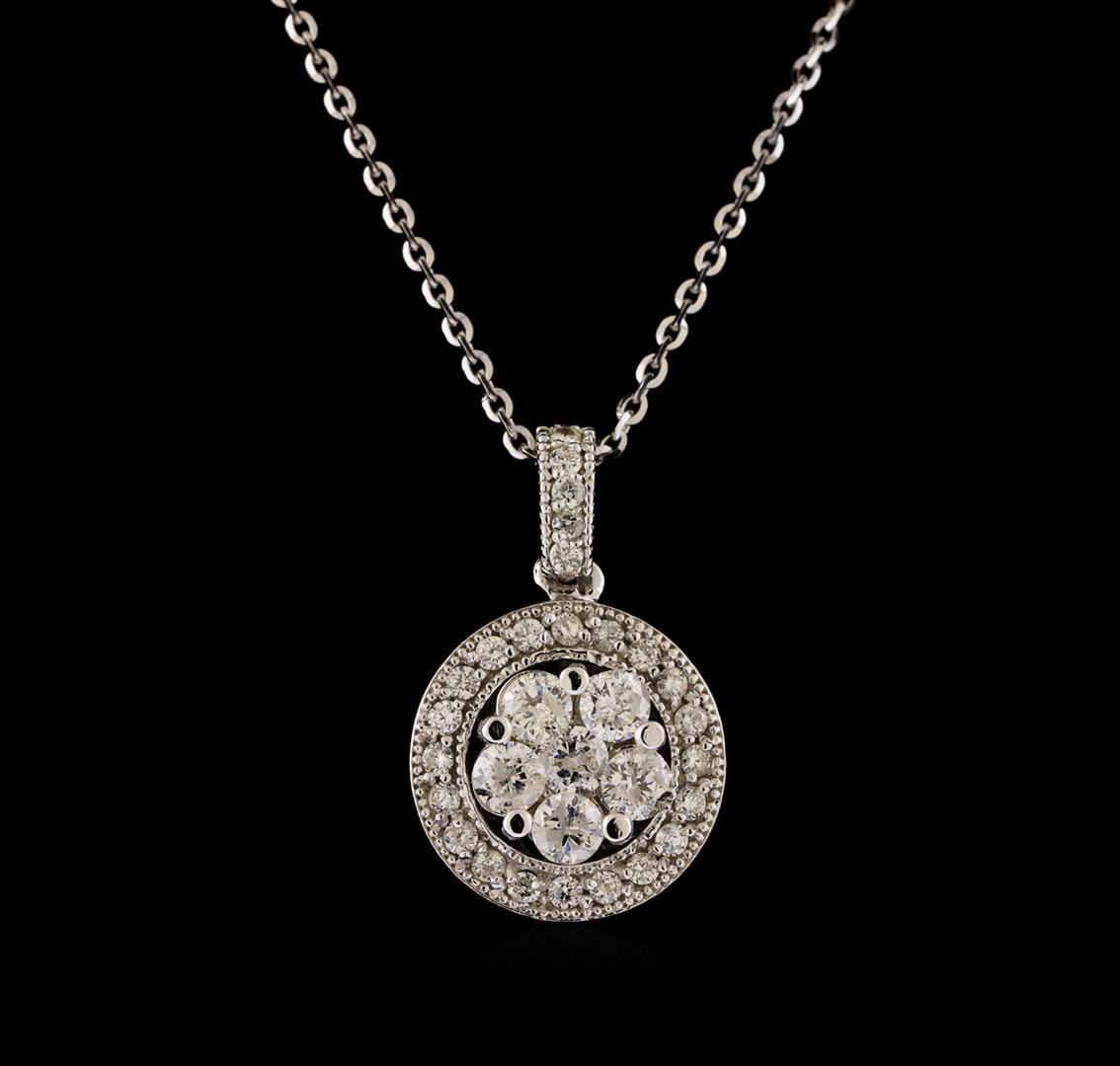 One electronically tested 14KT white gold ladies combination cast & assembled diamond pendant & chain 18.0 long, medium cable link with a lobster claw clasp with a bright polish finish. Identified with markings of 14K. Condition is new. Containing: Twenty-Six prong set round brilliant cut diamonds, measuring 1.50 - 1.50 x 0.90mm (depth est.) approximate total weight of 26 Stones = 0.32ct. Clarity: SI-2 to I-2. Color: I - J, Cut is Good. Six prong set round brilliant cut diamonds, measuring 3.00 - 3.00 x 1.80mm (depth est.) approximate total weight of 6 Stones = 0.59ct. Clarity: I-1 to I-2. Color: H - I, Cut is Good. All diamonds are graded in the mounting, unless otherwise stated. Total Weight of Diamonds 0.91ct. Total Weight of Pendant & Chain 7.50 grams. GGL Appraised.