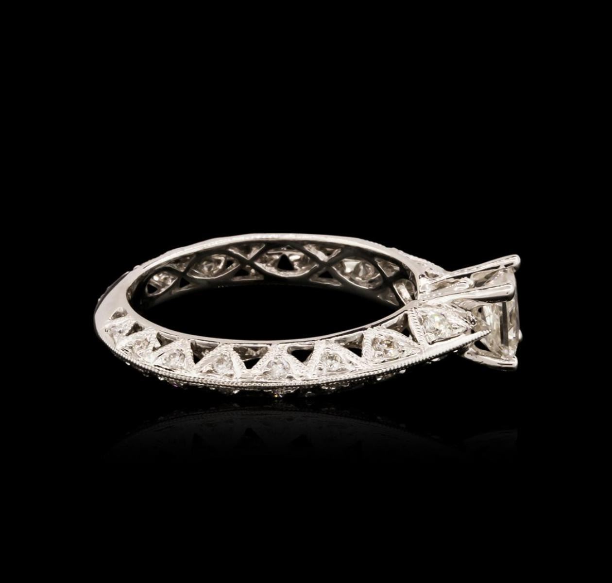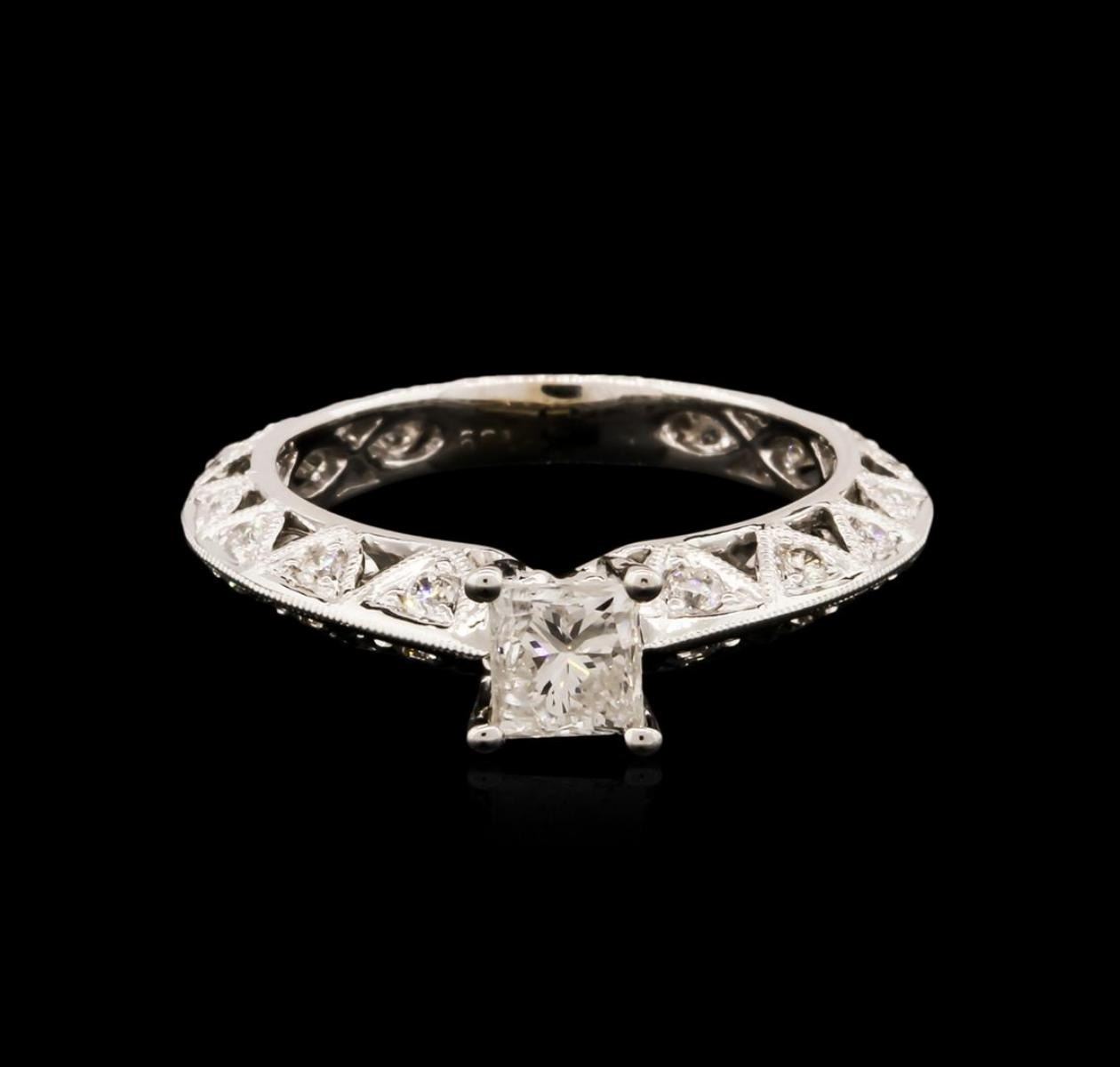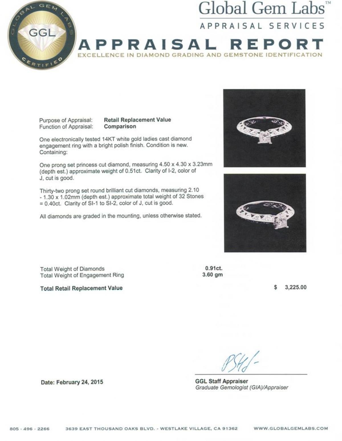 One electronically tested 14KT white gold ladies cast diamond engagement ring with a bright polish finish. Condition is new. Containing: One prong set princess cut diamond, measuring 4.50 x 4.30 x 3.23mm (depth est.) approximate weight of 0.51ct. Clarity: I-2. Color: J, Cut is Good. Thirty-Two prong set round brilliant cut diamonds, measuring 2.10 - 1.30 x 1.02mm (depth est.) approximate total weight of 32 Stones = 0.40 ct. Clarity: SI-1 to SI-2. Color: J, Cut is Good. All diamonds are graded in the mounting, unless otherwise stated. Total Weight of Diamonds 0.91ct. Total Weight of Engagement Ring 3.60 grams. GGL Appraised.
