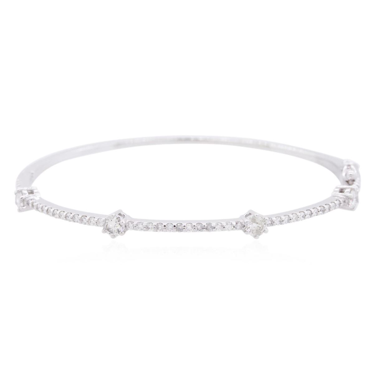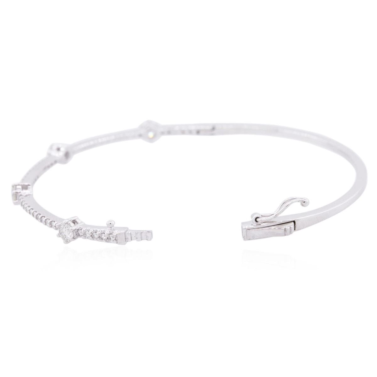 One electronically tested 14KT white gold ladies cast diamond bangle bracelet with a hidden box clasp with safety closer with a bright polish finish. Condition is new. Containing: Four prong set round brilliant cut diamonds, measuring 3.50 - 3.50 x 2.10mm (depth est.) approximate total weight of 4 Stones = 0.63ct. Clarity: SI-2 to I-1. Color: J, Cut is Good. Forty-Five prong set round brilliant cut diamonds, measuring 1.20 - 1.20 x 0.72mm (depth est.) approximate total weight of 45 Stones = 0.28ct. Clarity: I-1 to I-2. Color: I - J, Cut is Good. All diamonds are graded in the mounting, unless otherwise stated. Total Weight of Diamonds 0.91ct. Total Weight of Bangle Bracelet 8.70 grams. GGL Appraised at $5,140.00.