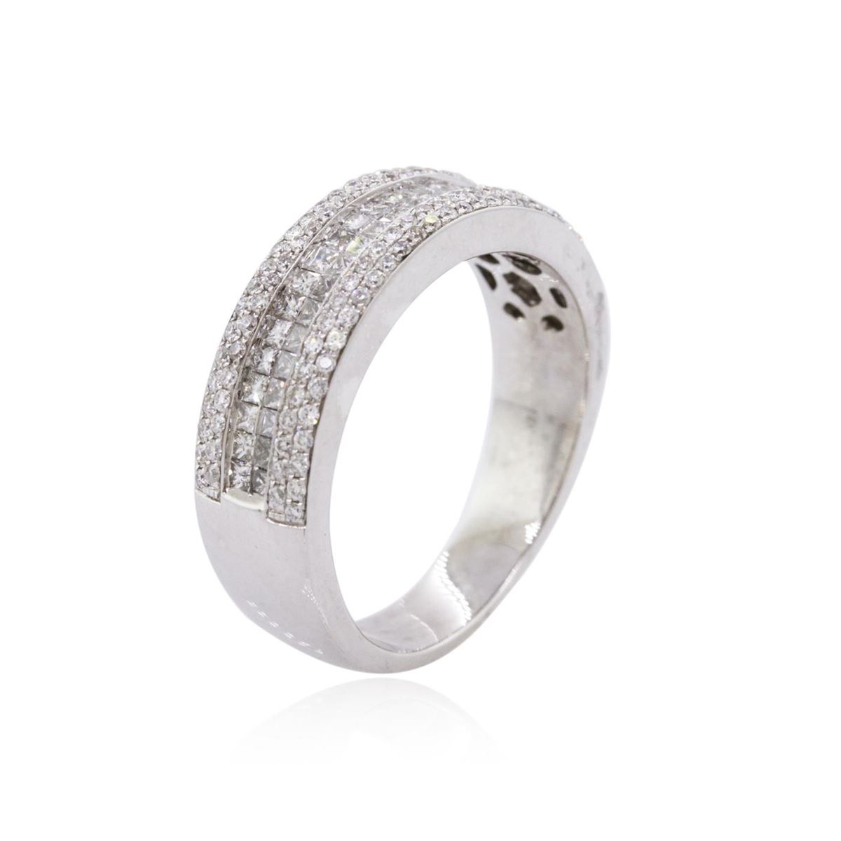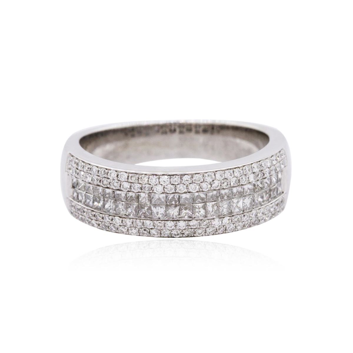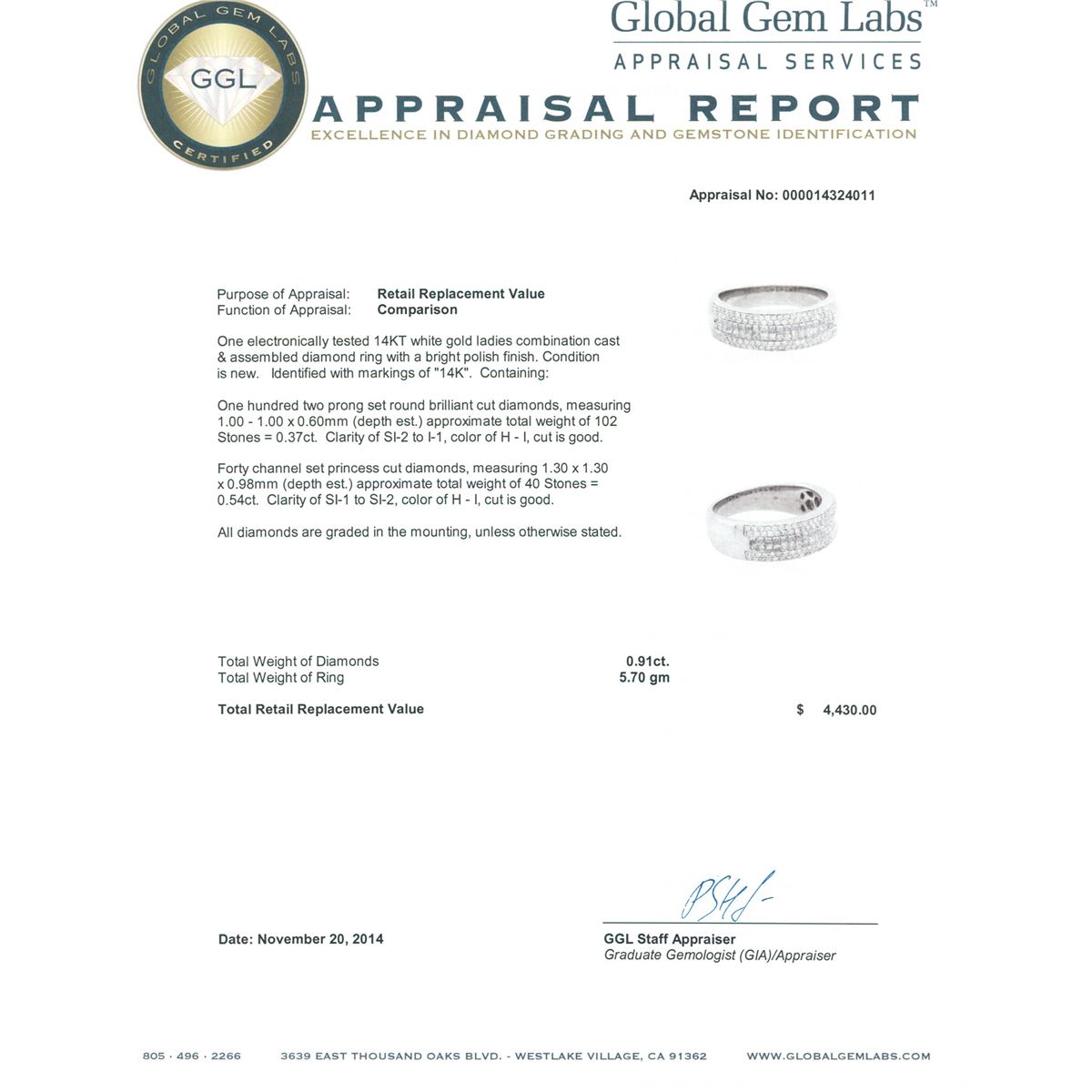 One electronically tested 14KT white gold ladies combination cast & assembled diamond ring with a bright polish finish. Identified with markings of "14K". Condition is new. Containing: One Hundred Two prong set round brilliant cut diamonds, measuring 1.00 - 1.00 x 0.60mm (depth est.) approximate total weight of 102 Stones = 0.37ct. Clarity: SI-2 to I-1. Color: H - I, Cut is Good. Forty channel set princess cut diamonds, measuring 1.30 x 1.30 x 0.98mm (depth est.) approximate total weight of 40 Stones = 0.54ct. Clarity: SI-1 to SI-2. Color: H - I, Cut is Good. All diamonds are graded in the mounting, unless otherwise stated. Total Weight of Diamonds 0.91ct. Total Weight of Ring 5.70 grams. GGL Appraised at $4,430.00.
