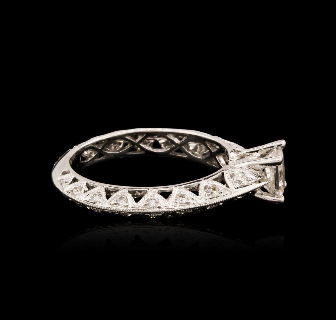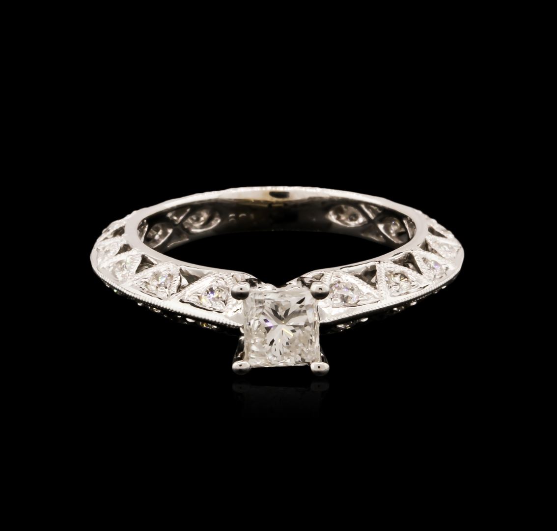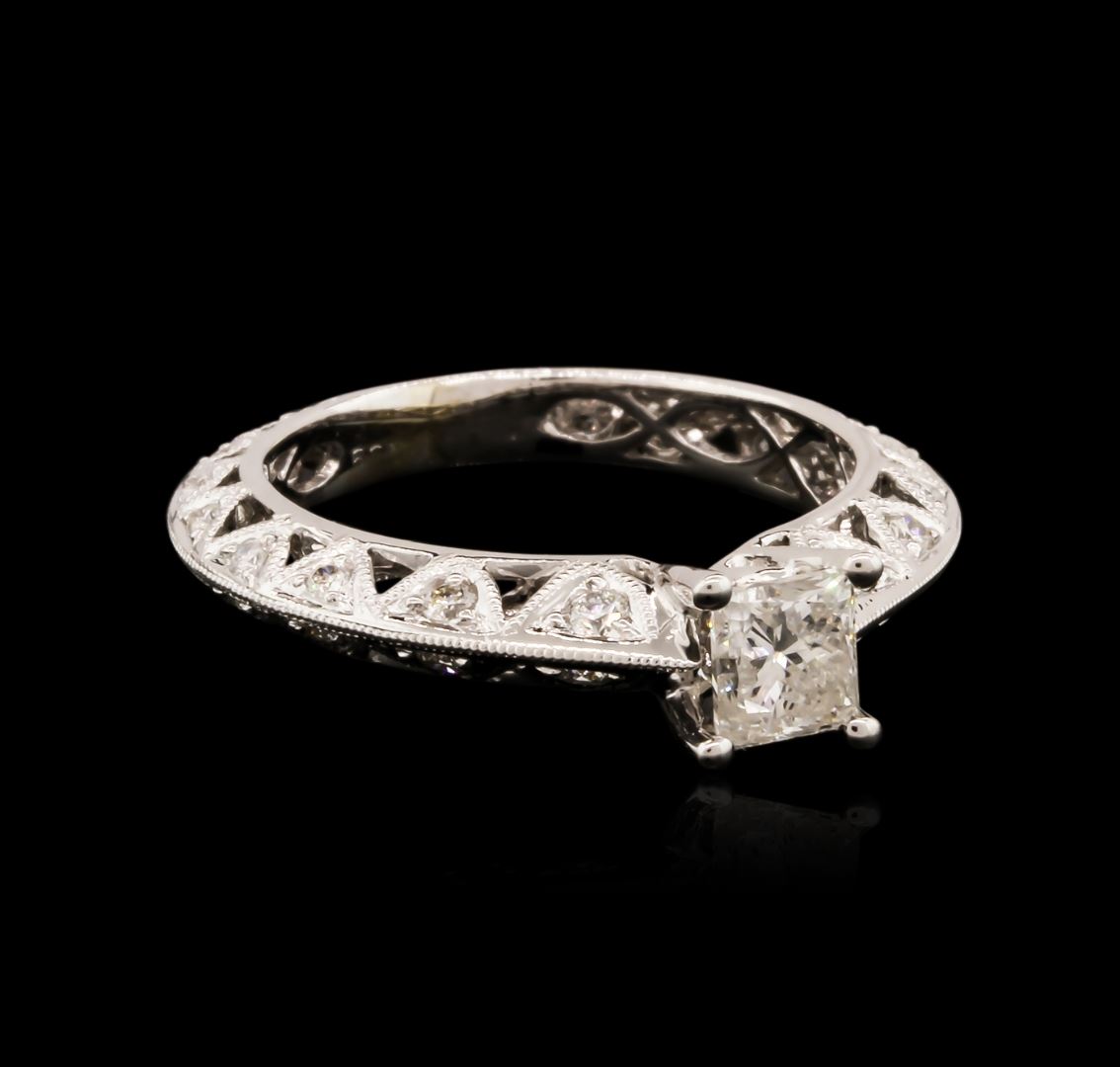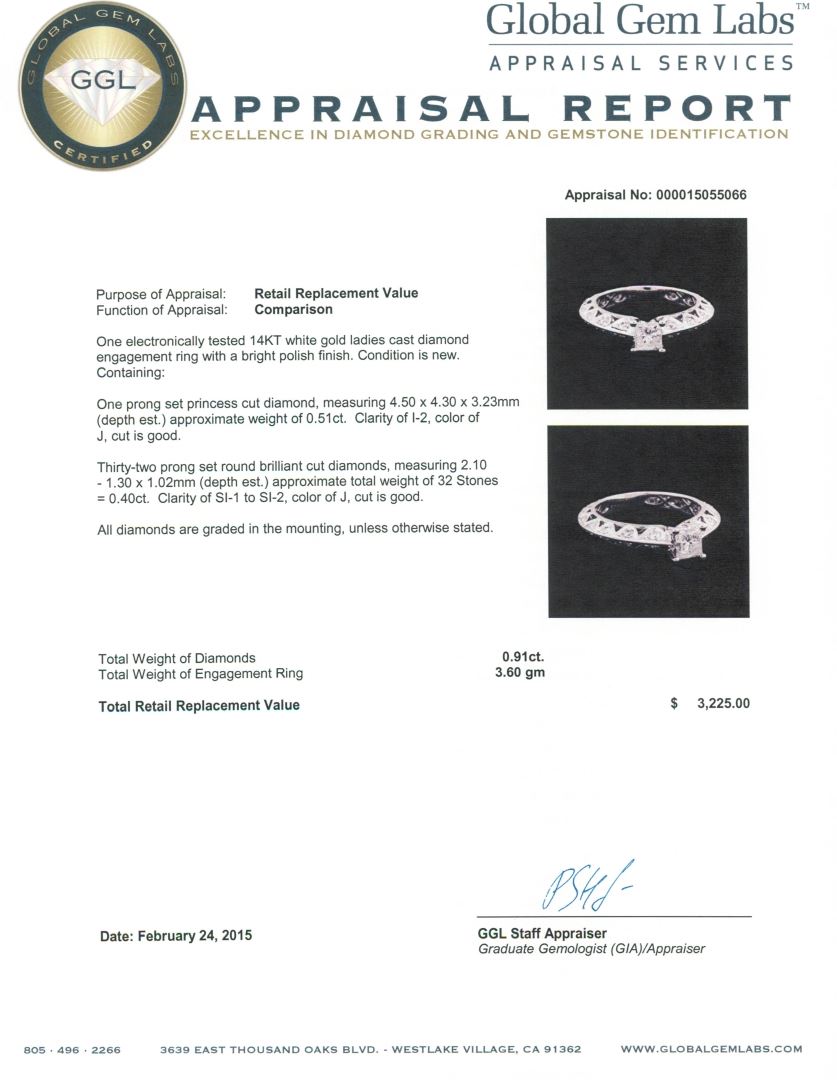 One electronically tested 14KT white gold ladies cast diamond engagement ring with a bright polish finish. Condition is new. Containing: One prong set princess cut diamond, measuring 4.50 x 4.30 x 3.23mm (depth est.) approximate weight of 0.51ct. Clarity: I-2. Color: J, Cut is Good. Thirty-Two prong set round brilliant cut diamonds, measuring 2.10 - 1.30 x 1.02mm (depth est.) approximate total weight of 32 Stones = 0.40ct. Clarity: SI-1 to SI-2. Color: J, Cut is Good. All diamonds are graded in the mounting, unless otherwise stated. Total Weight of Diamonds 0.91ct. Total Weight of Engagement Ring 3.60 grams. GGL Appraised at $3,225.00.