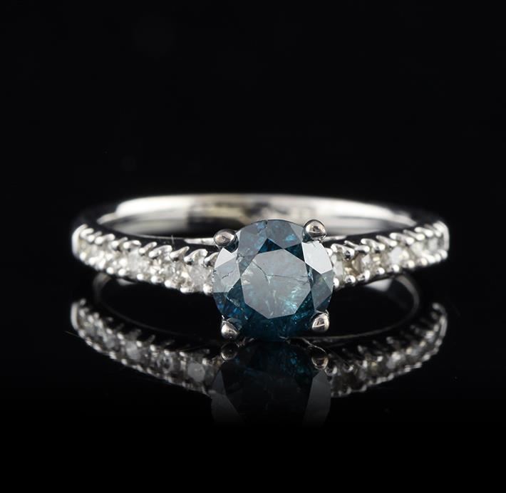 One electronically tested 14KT white gold ladies cast diamond unity ring with a bright polish finish. Condition is new, good workmanship. The featured diamond is supported by diamond set shoulders and completed by a two millimeter wide band. Identified with markings of "14K". Containing: One prong set round brilliant cut diamond, measuring 6.20 - 6.10 x 3.69mm (depth est.) approximate weight of 0.92ct Indications of laboratory irradiated enhanced color. Graded in the setting. Clarity: I-3. Color: fancy slightly greenish blue. Depth: 60.0%. Table: 58.5%. Ten prong set round brilliant cut diamonds, measuring 1.60 - 1.60 x 0.96mm (depth est.) approximate total weight of 10 stones = 0.18ct. Graded in the setting. Clarity: I-2 to I-3. Color: G - I. Total weight of diamonds 1.10ct. Total weight of ring 2.60gm. AIG Appraised at $3,755.00.