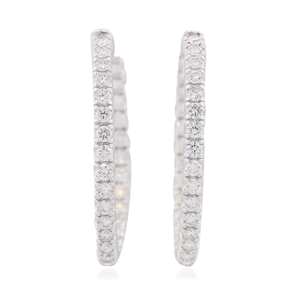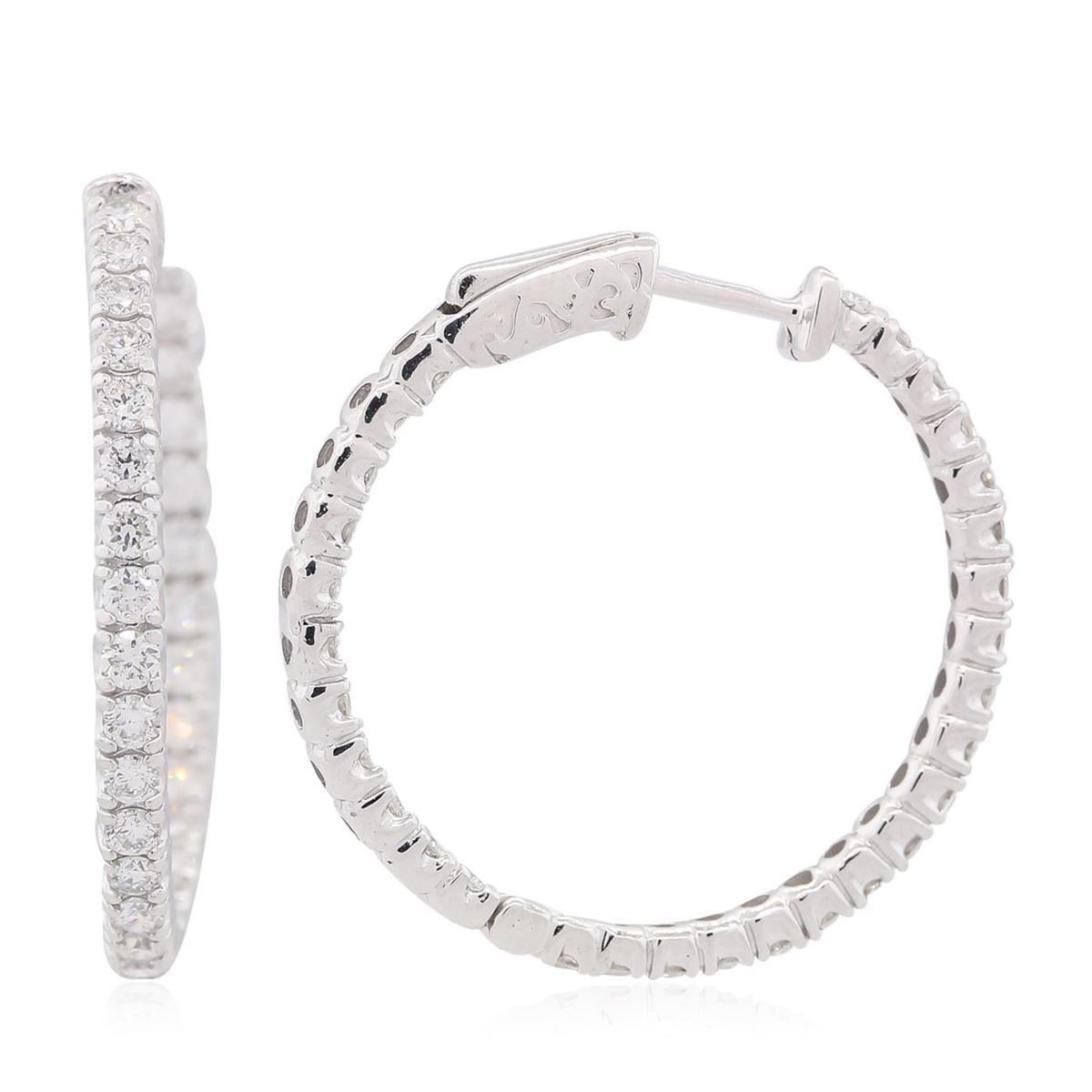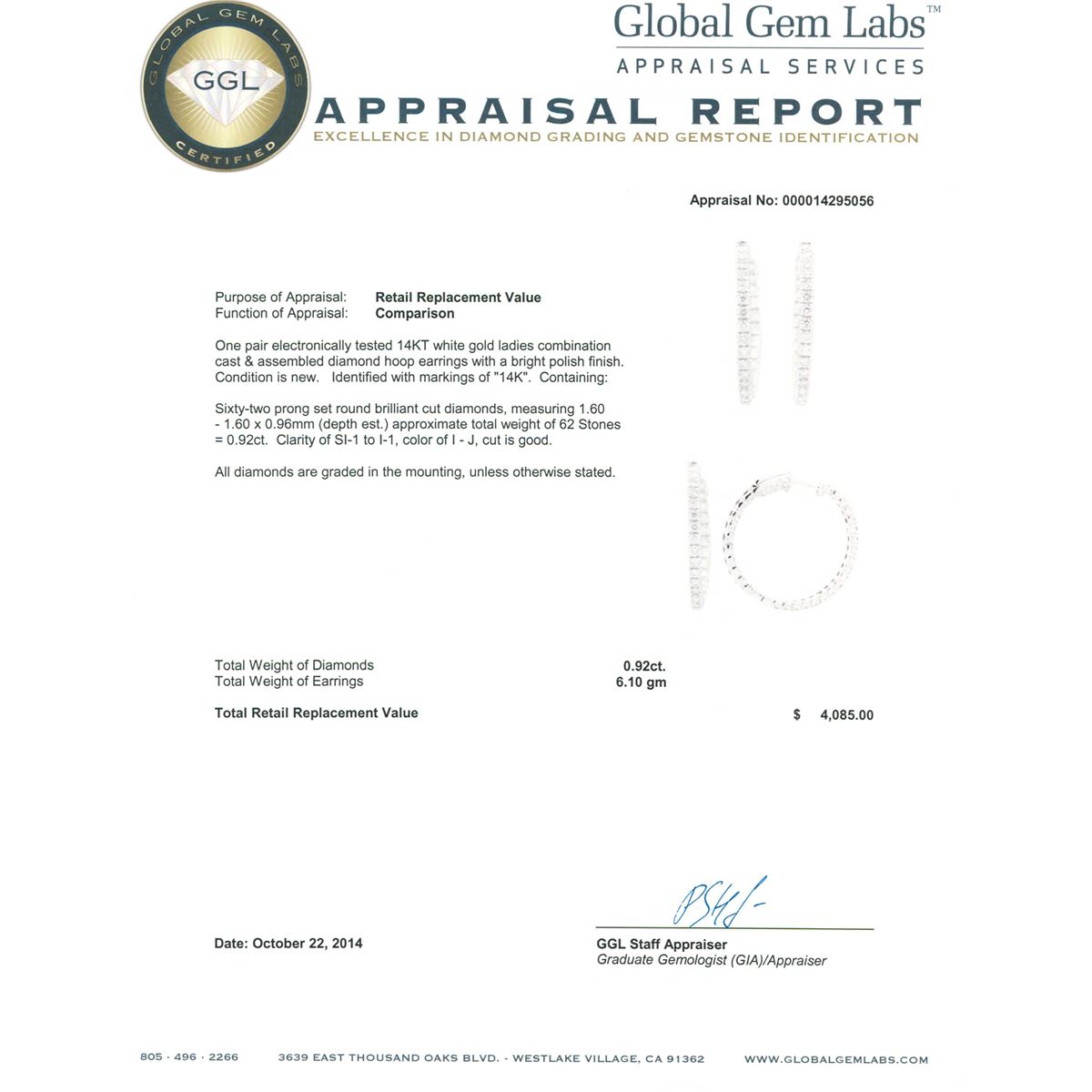 One pair electronically tested 14KT white gold ladies combination cast & assembled diamond hoop earrings with a bright polish finish. Identified with markings of "14K". Condition is new. Containing: Sixty-Two prong set round brilliant cut diamonds, measuring 1.60 - 1.60 x 0.96mm (depth est.) approximate total weight of 62 Stones = 0.92ct. Clarity: SI-1 to I-1. Color: I - J, Cut is Good. All diamonds are graded in the mounting, unless otherwise stated. Total Weight of Diamonds 0.92ct. Total Weight of Earrings 6.10 grams. GGL Appraised at $4,085.00.