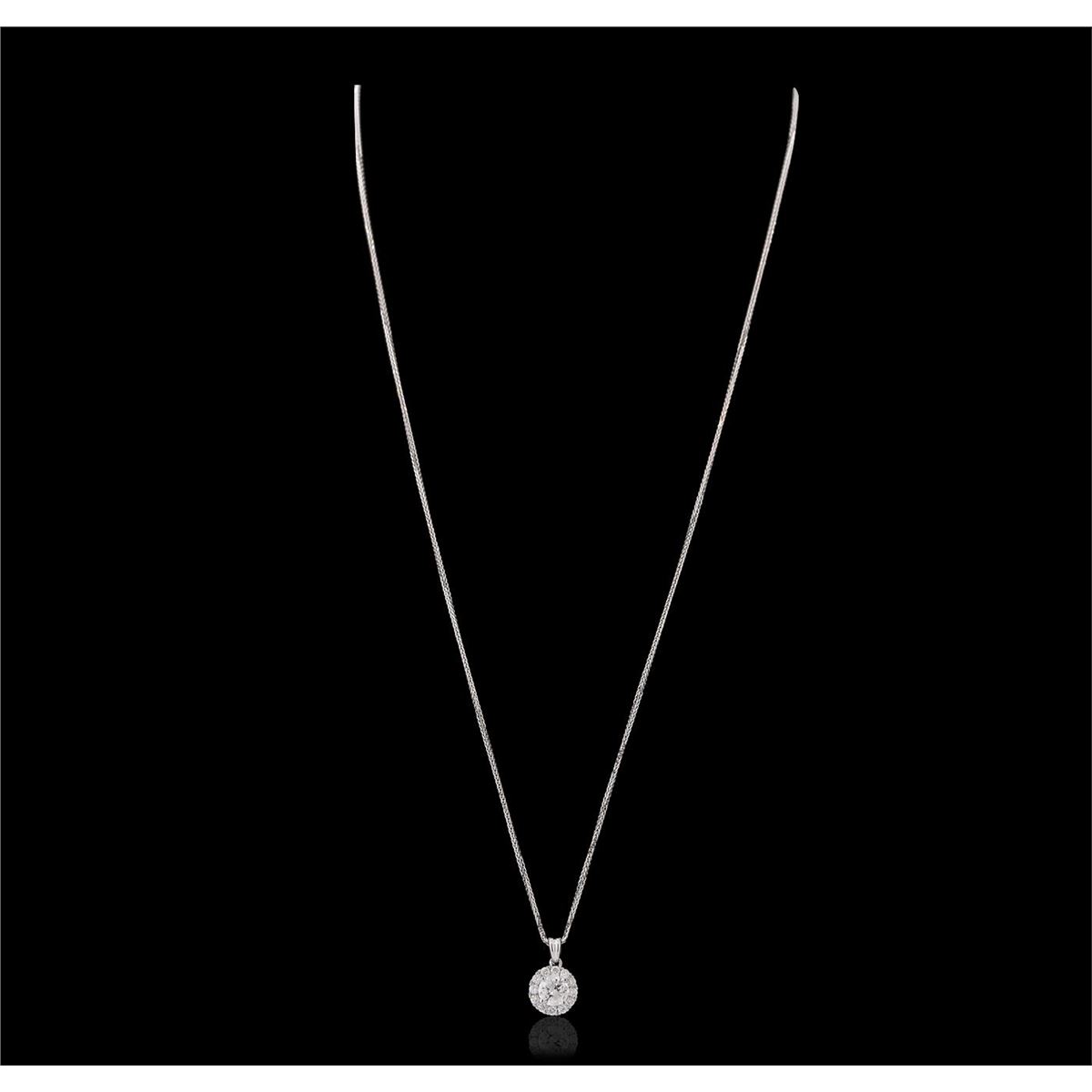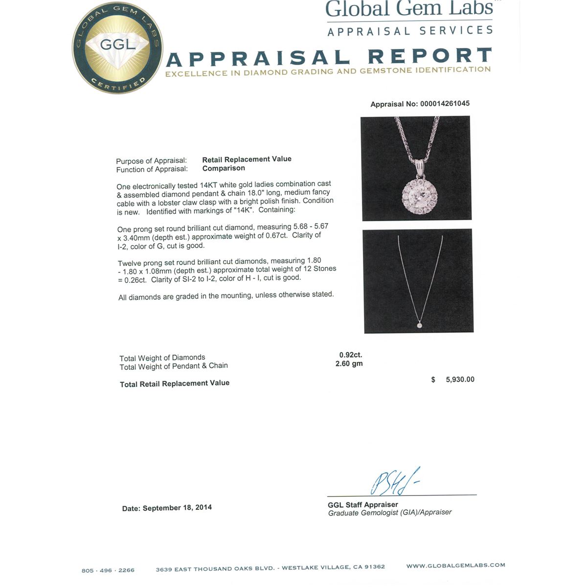 One electronically tested 14KT white gold ladies combination cast & assembled diamond pendant & chain 18.0" long, medium fancy cable with a lobster claw clasp with a bright polish finish. Identified with markings of "14K". Condition is new. Containing: One prong set round brilliant cut diamond, measuring 5.68 - 5.67 x 3.40mm (depth est.) approximate weight of 0.67ct. Clarity: I-2. Color: G, Cut is Good. Twelve prong set round brilliant cut diamonds, measuring 1.80 - 1.80 x 1.08mm (depth est.) approximate total weight of 12 Stones = 0.26ct. Clarity: SI-2 to I-2. Color: H - I, Cut is Good. All diamonds are graded in the mounting, unless otherwise stated. Total Weight of Diamonds 0.92ct. Total Weight of Pendant & Chain 2.60 grams. GGL Appraised at $5,930.00.