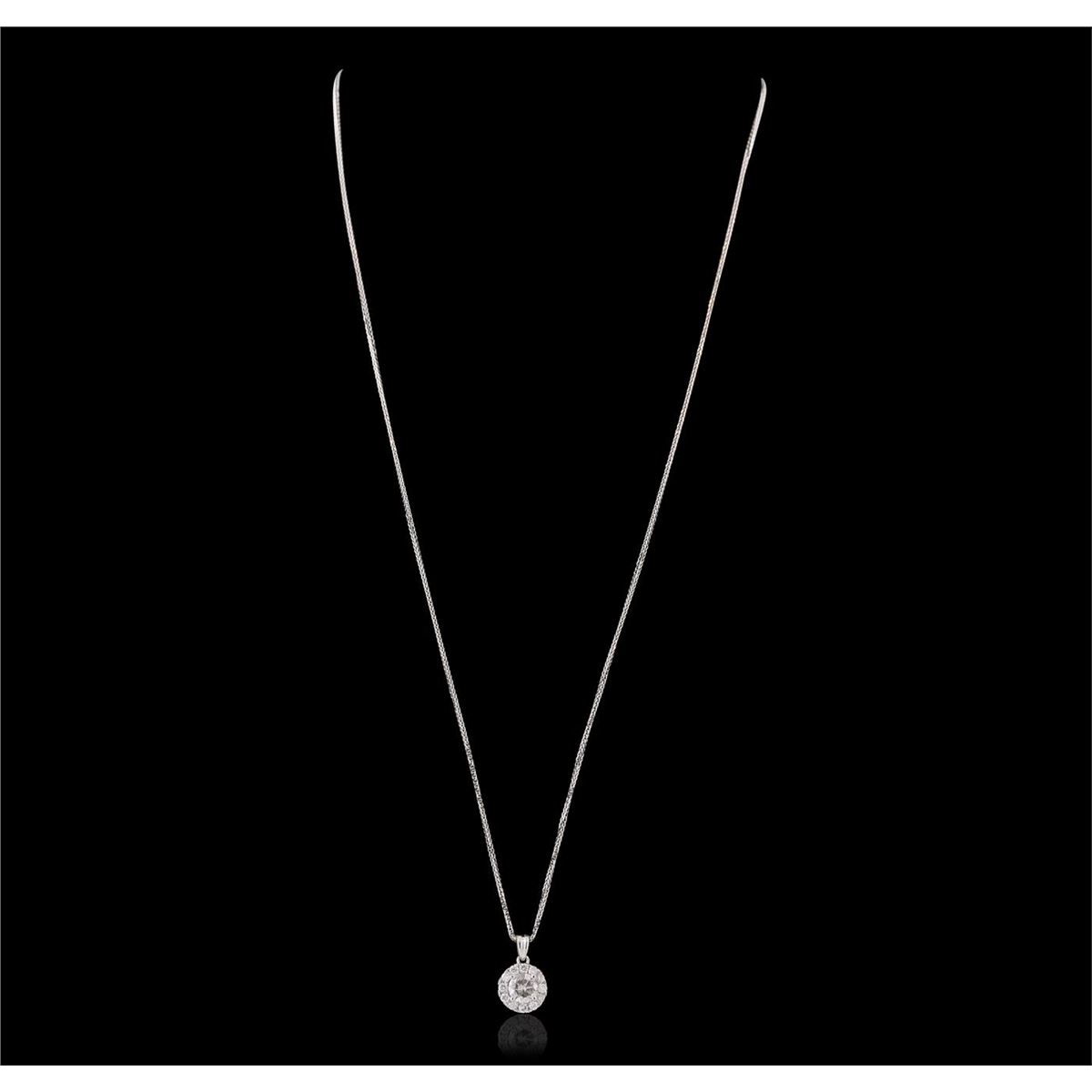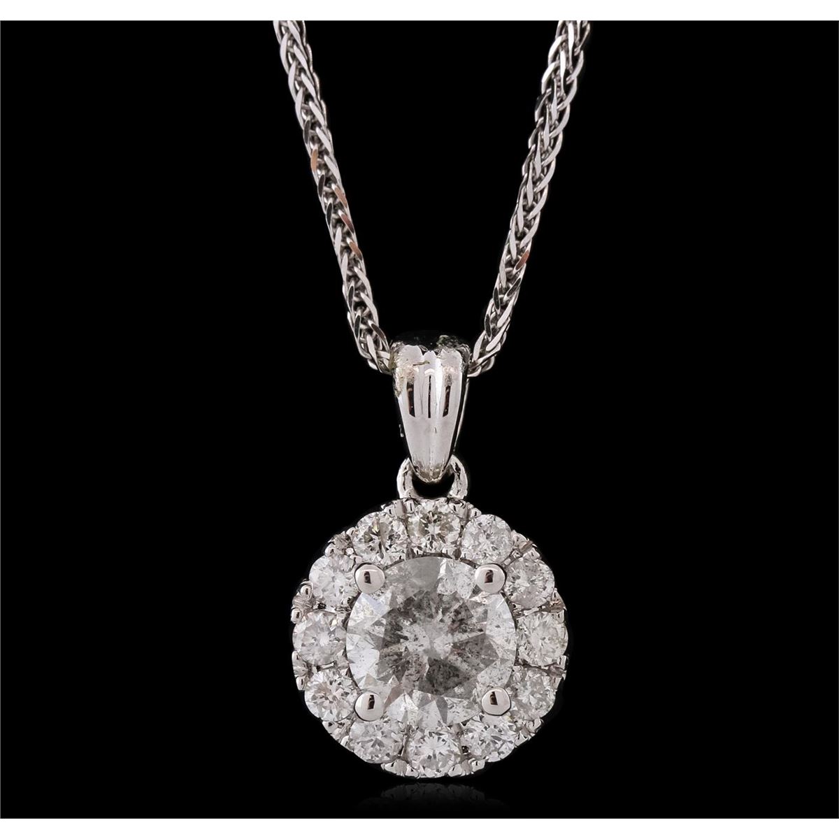One electronically tested 14KT white gold ladies combination cast & assembled diamond pendant & chain 18.0" long, medium fancy cable with a lobster claw clasp with a bright polish finish. Identified with markings of "14K". Condition is new. Containing: One prong set round brilliant cut diamond, measuring 5.58 - 5.55 x 3.50mm (depth est.) approximate weight of 0.66ct. Clarity: I-3. Color: G, Cut is Good. Twelve prong set round brilliant cut diamonds, measuring 1.80 - 1.80 x 1.08mm (depth est.) approximate total weight of 12 Stones = 0.26ct. Clarity: SI-2 to I-2. Color: H - J, Cut is Good. All diamonds are graded in the mounting, unless otherwise stated. Total Weight of Diamonds 0.92ct. Total Weight of Pendant & Chain 2.70 grams. GGL Appraised at $3,320.00.