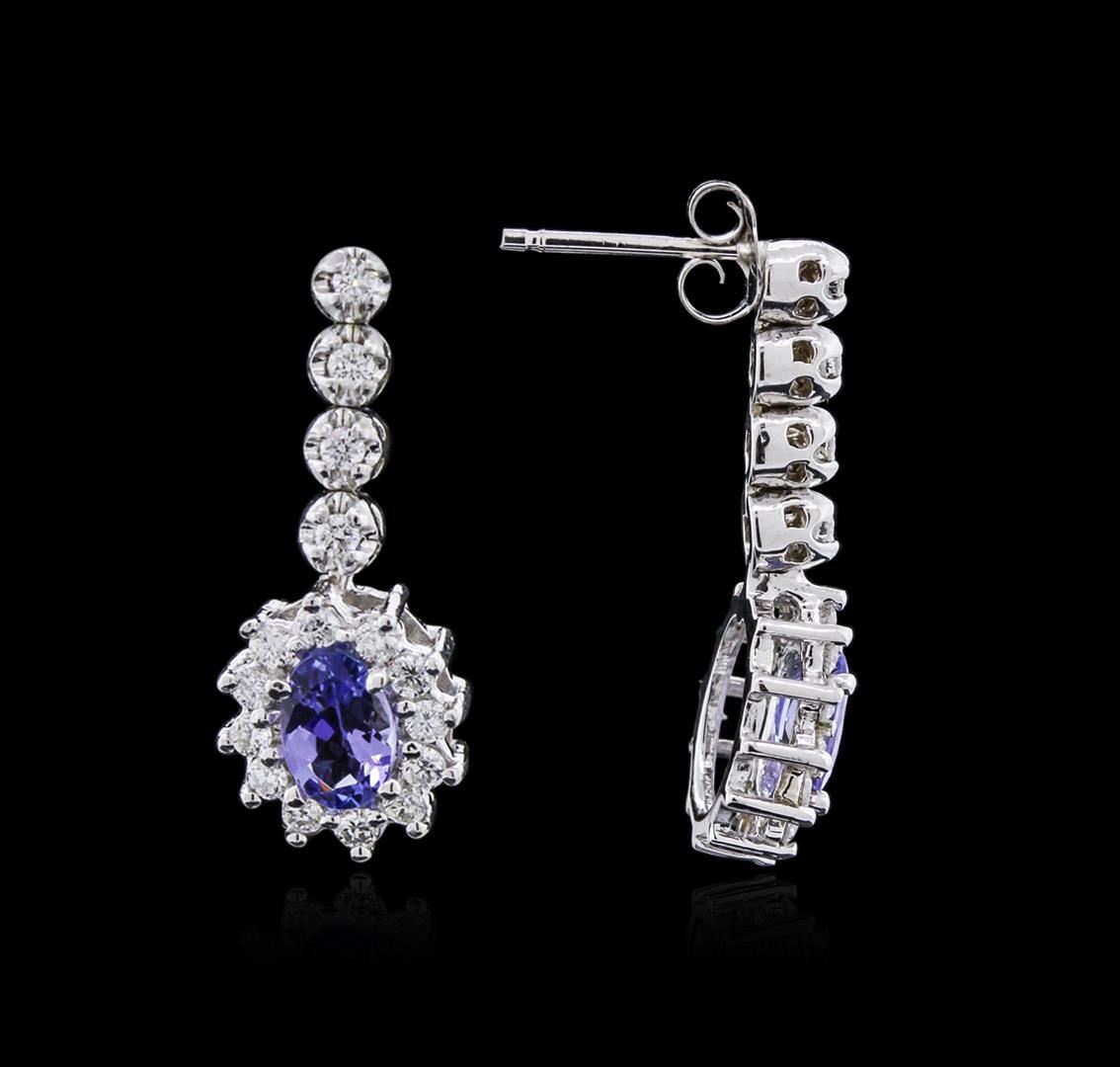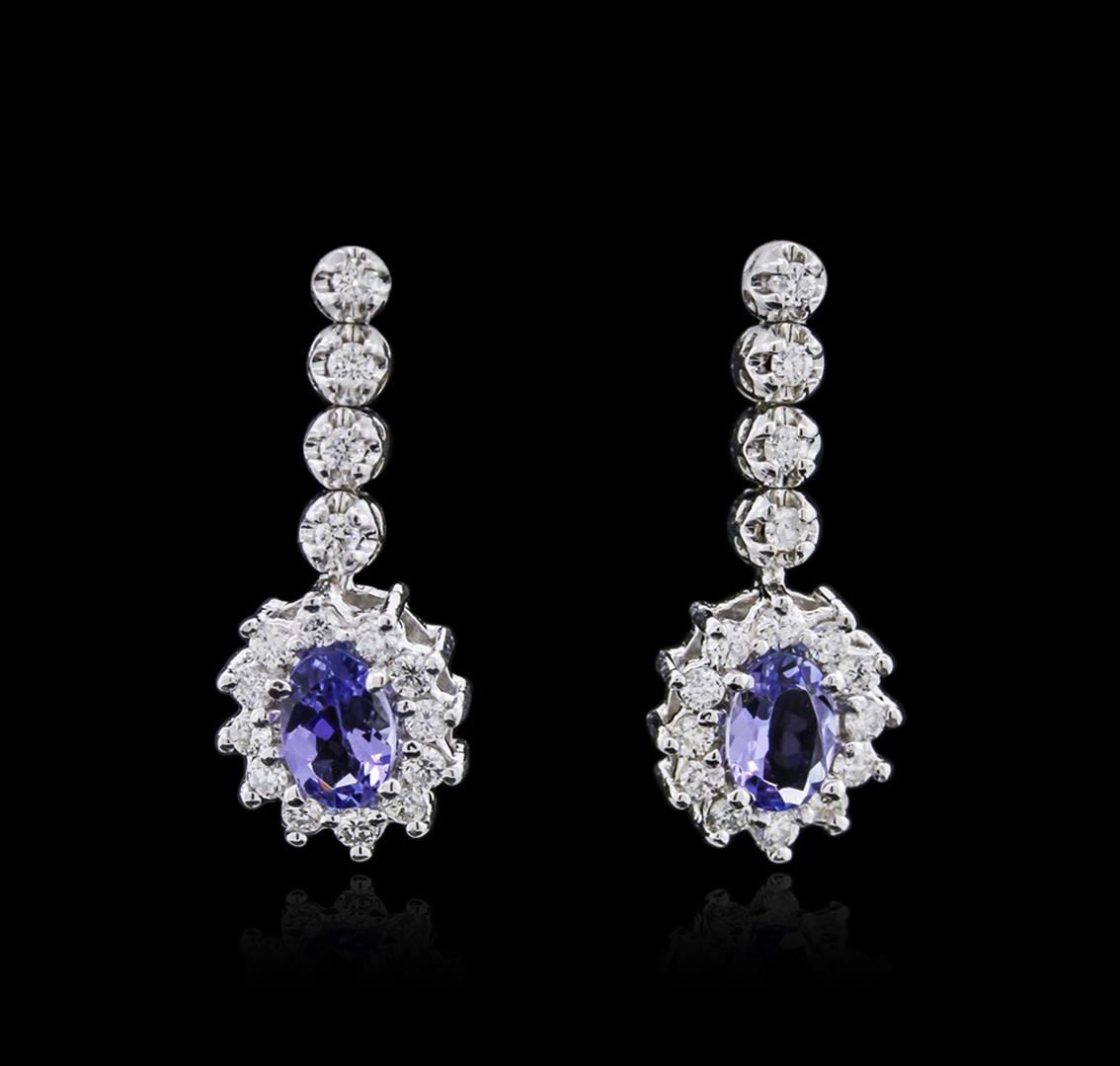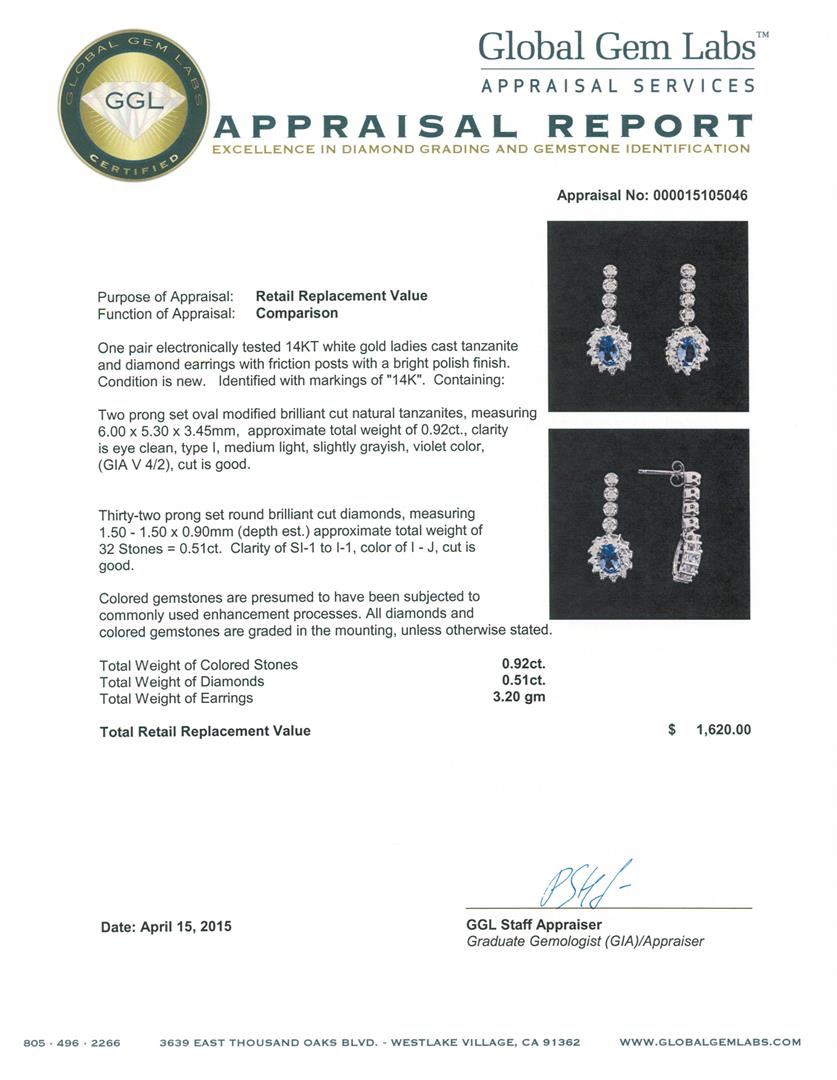One pair electronically tested 14KT white gold ladies cast tanzanite and diamond earrings with friction posts with a bright polish finish. Identified with markings of "14K". Condition is new. Containing: Two prong set oval modified brilliant cut natural tanzanites, measuring 6.00. x 5.30 x 3.45mm, approximate total weight of 0.92ct., clarity is eye clean, type I, medium light, slightly grayish, violet color, (GIA V 4/2), cut is good. Thirty-Two prong set round brilliant cut diamonds, measuring 1.50 - 1.50 x 0.90mm (depth est.) approximate total weight of 32 Stones = 0.51ct. Clarity: SI-1 to I-1. Color: I - J, Cut is Good. Colored gemstones are presumed to have been subjected to commonly used enhancement processes. All diamonds and colored gemstones are graded in the mounting, unless otherwise stated. Total Weight of Colored Stones 0.92ct. Total Weight of Diamonds 0.51ct. Total Weight of Earrings 3.20 grams. GGL Appraised at $1,620.00.