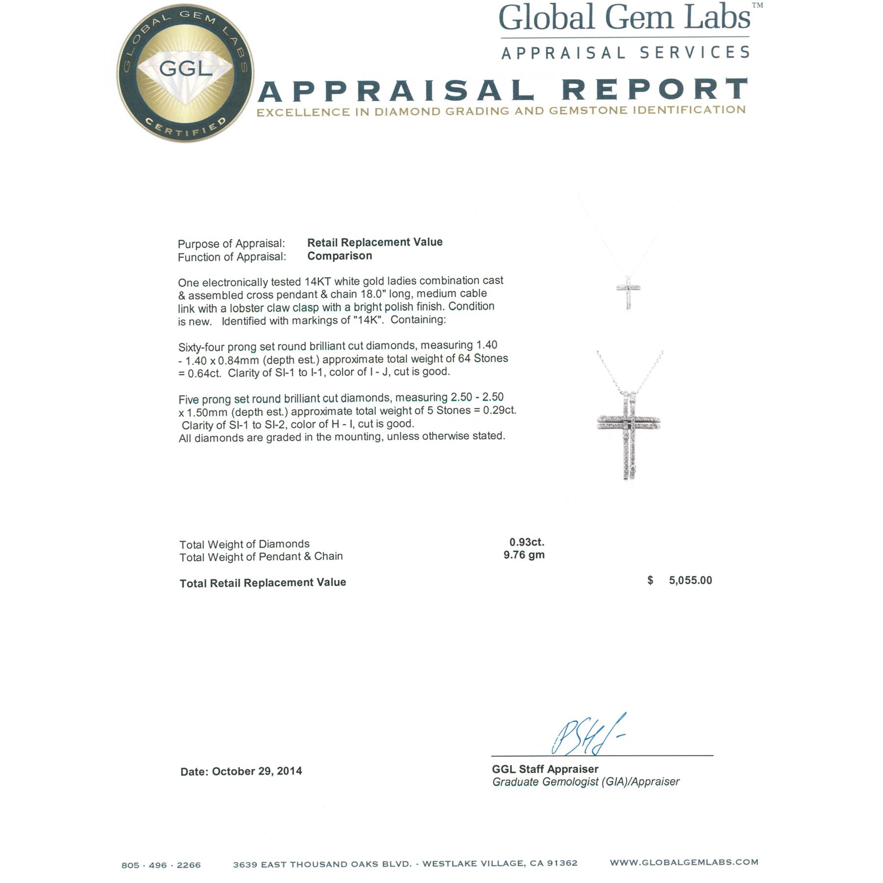 One electronically tested 14KT white gold ladies combination cast & assembled cross pendant & chain 18.0 long, medium cable link with a lobster claw clasp with a bright polish finish. Identified with markings of 14K. Condition is new. Containing: Sixty-Four prong set round brilliant cut diamonds, measuring 1.40 - 1.40 x 0.84mm (depth est.) approximate total weight of 64 Stones = 0.64ct. Clarity: SI-1 to I-1. Color: I - J, Cut is Good. Five prong set round brilliant cut diamonds, measuring 2.50 - 2.50 x 1.50mm (depth est.) approximate total weight of 5 Stones = 0.29ct. Clarity: SI-1 to SI-2. Color: H - I, Cut is Good. All diamonds are graded in the mounting, unless otherwise stated. Total Weight of Diamonds 0.93ct. Total Weight of Pendant & Chain 9.76 grams. GGL Appraised at $5,055.00.