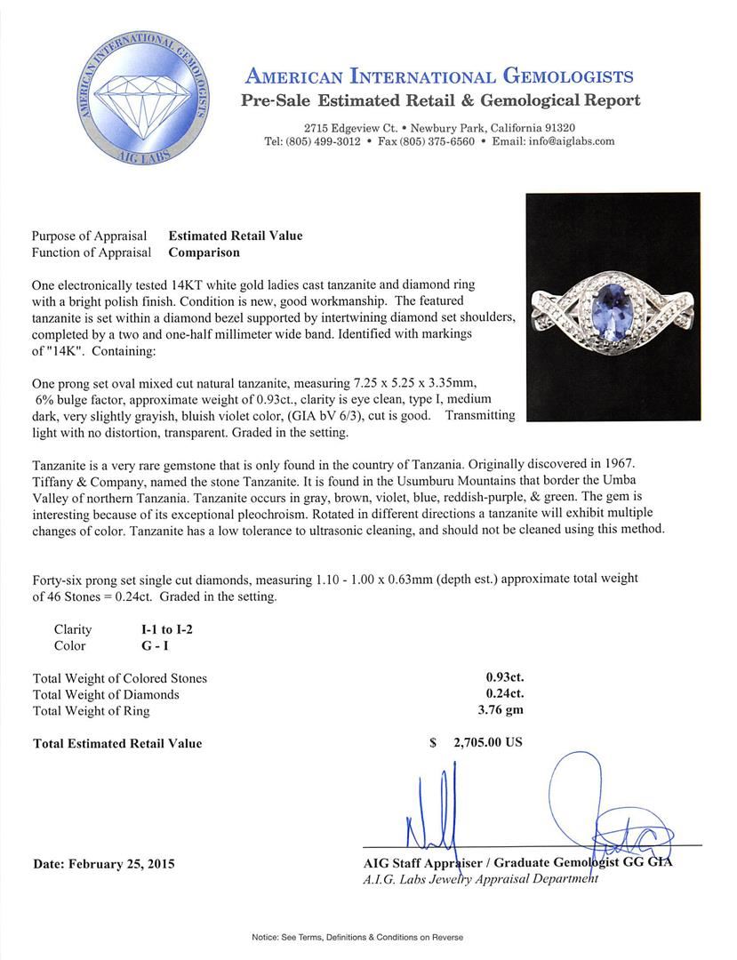One electronically tested 14KT white gold ladies cast tanzanite and diamond ring with a bright polish finish. The featured tanzanite is set within a diamond bezel supported by intertwining diamond set shoulders, completed by a two and one-half millimeter wide band. Identified with markings of "14K". Condition is new, good workmanship. Containing: One prong set oval mixed cut natural tanzanite, measuring 7.25 x 5.25 x 3.35mm, 6%. bulge factor, approximate weight of 0.93ct., clarity is eye clean, type I, medium dark, very slightly grayish, bluish violet color, (GIA bV 6/3), cut is good. Transmitting light with no distortion, transparent. Graded in the setting. Tanzanite is a very rare gemstone that is only found in the country of Tanzania. Originally discovered in 1967. Tiffany & Company, named the stone Tanzanite. It is found in the Usumburu Mountains that border the Umba Valley of northern Tanzania. Tanzanite occurs in gray, brown, violet, blue, reddish-purple, & green. The gem is interesting because of its exceptional pleochroism. Rotated in different directions a tanzanite will exhibit multiple changes of color. Tanzanite has a low tolerance to ultrasonic cleaning, and should not be cleaned using this method. Forty-Six prong set single cut diamonds, measuring 1.10 - 1.00 x 0.63mm (depth est.) approximate total weight of 46 Stones = 0.24ct. Graded in the setting. Clarity: I-1 to I-2. Color: G - I. Total Weight of Colored Stones 0.93ct. Total Weight of Diamonds 0.24ct. Total Weight of Ring 3.76 grams. AIG Appraised at $2,705.00.