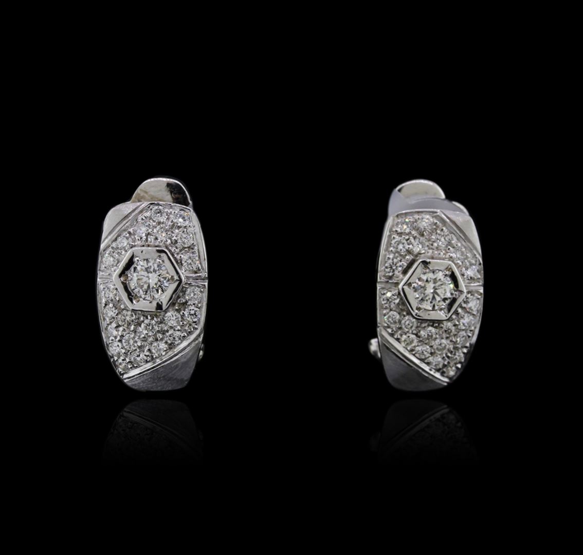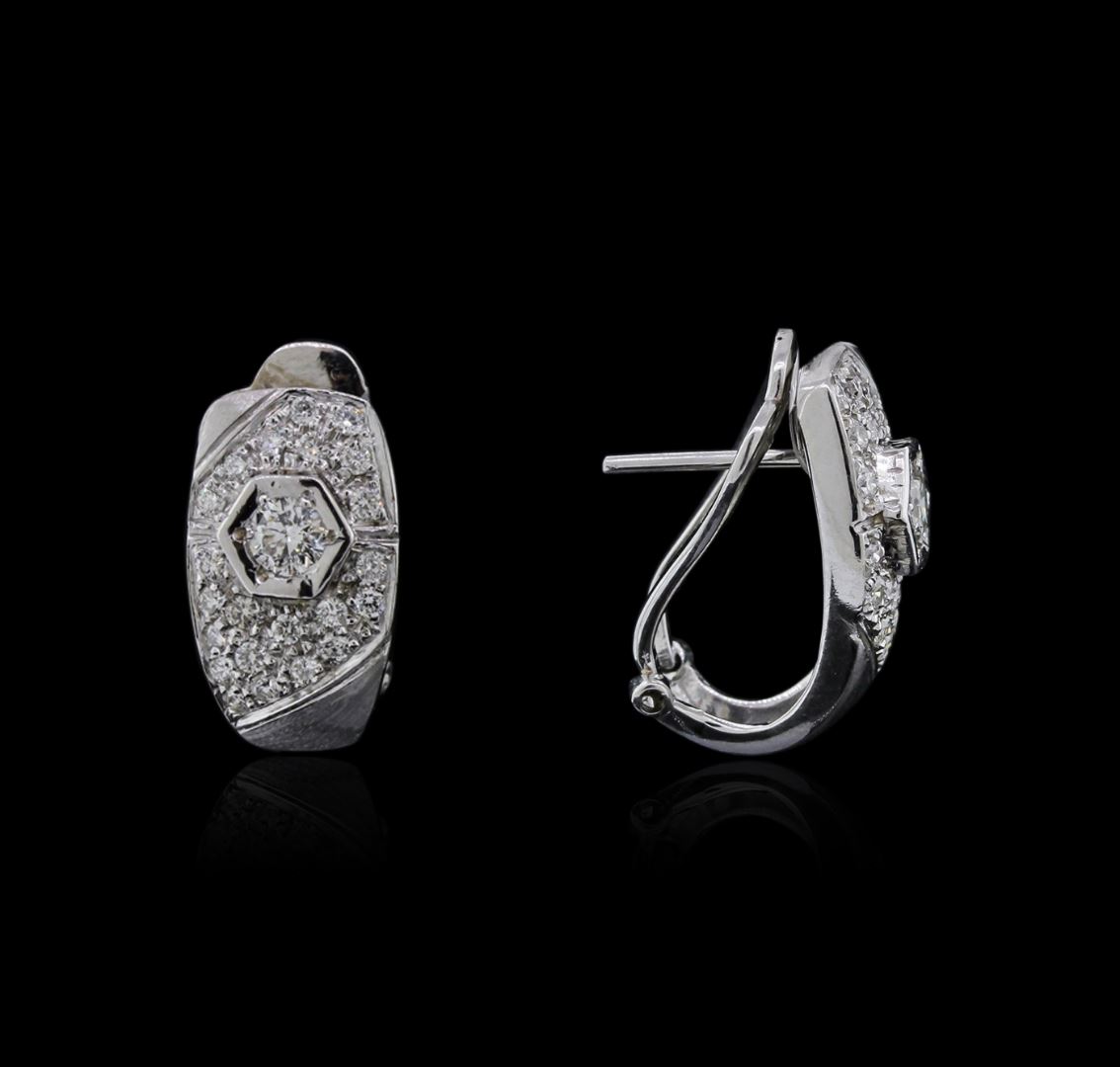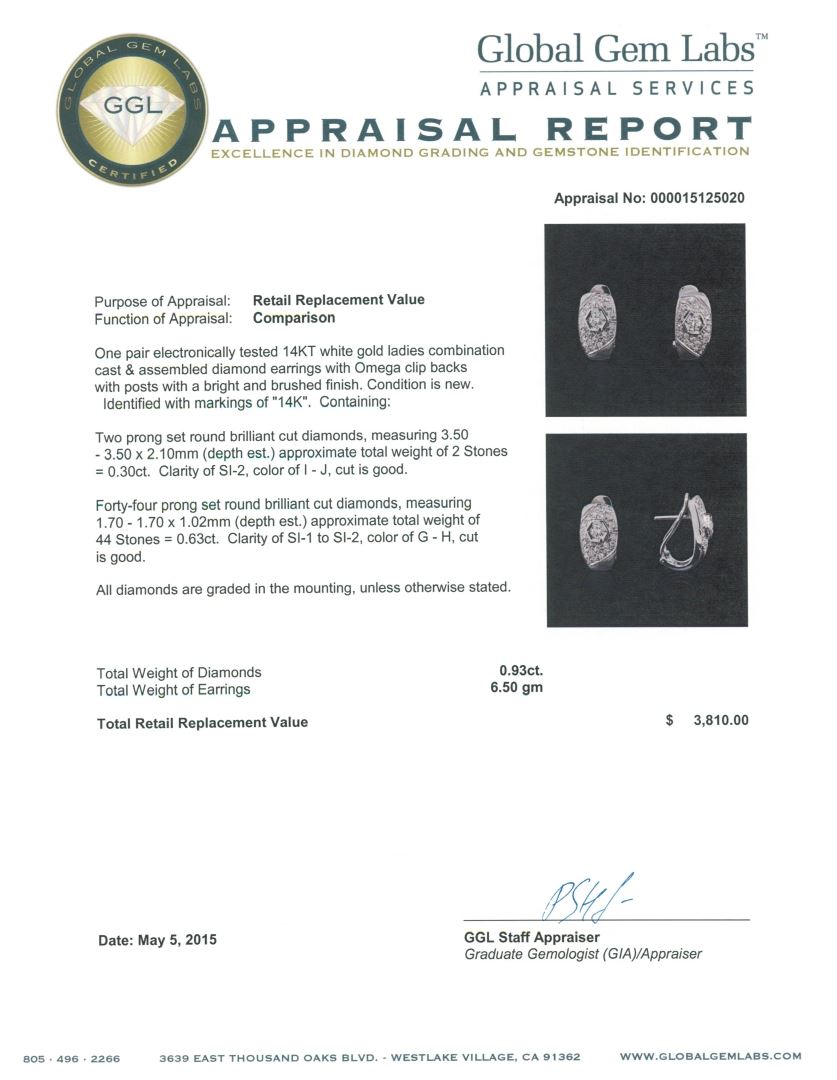 One pair electronically tested 14KT white gold ladies combination cast & assembled diamond earrings with Omega clip backs with posts with a bright and brushed finish. Identified with markings of "14K". Condition is new. Containing: Two prong set round brilliant cut diamonds, measuring 3.50 - 3.50 x 2.10mm (depth est.) approximate total weight of 2 Stones = 0.30ct. Clarity: SI-2. Color: I - J, Cut is Good. Forty-Four prong set round brilliant cut diamonds, measuring 1.70 - 1.70 x 1.02mm (depth est.) approximate total weight of 44 Stones = 0.63ct. Clarity: SI-1 to SI-2. Color: G - H, Cut is Good. All diamonds are graded in the mounting, unless otherwise stated. Total Weight of Diamonds 0.93ct. Total Weight of Earrings 6.50 grams. GGL Appraised at $3,810.00.