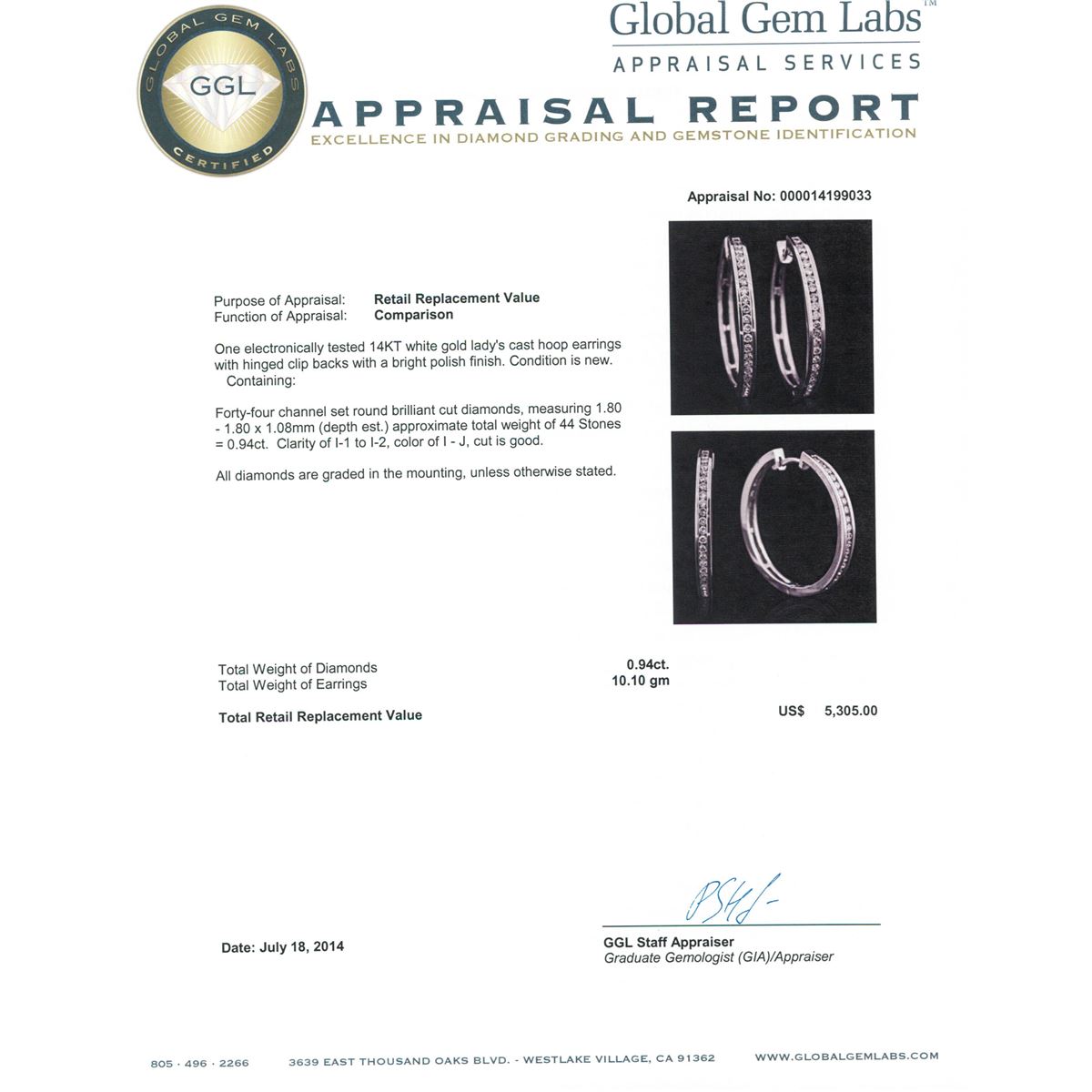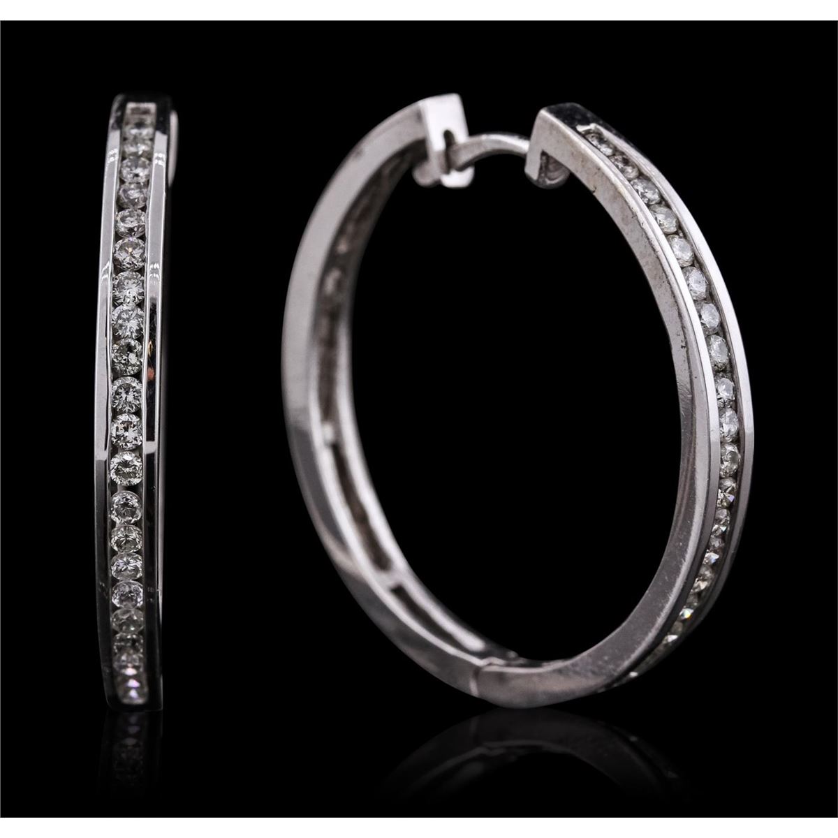 One electronically tested 14KT white gold Ladies cast hoop earrings with hinged clip backs with a bright polish finish. Condition is new. Containing: Forty-Four channel set round brilliant cut diamonds, measuring 1.80 - 1.80 x 1.08mm (depth est.) approximate. Total Weight of 44 Stones = 0.94ct. Clarity: I-1 to I-2. Color: I - J, Cut is Good. All diamonds are graded in the mounting, unless otherwise stated. Total Weight of Diamonds 0.94ct. Total Weight of Earrings 10.10 grams.. GGL Appraised at $5,305.00.