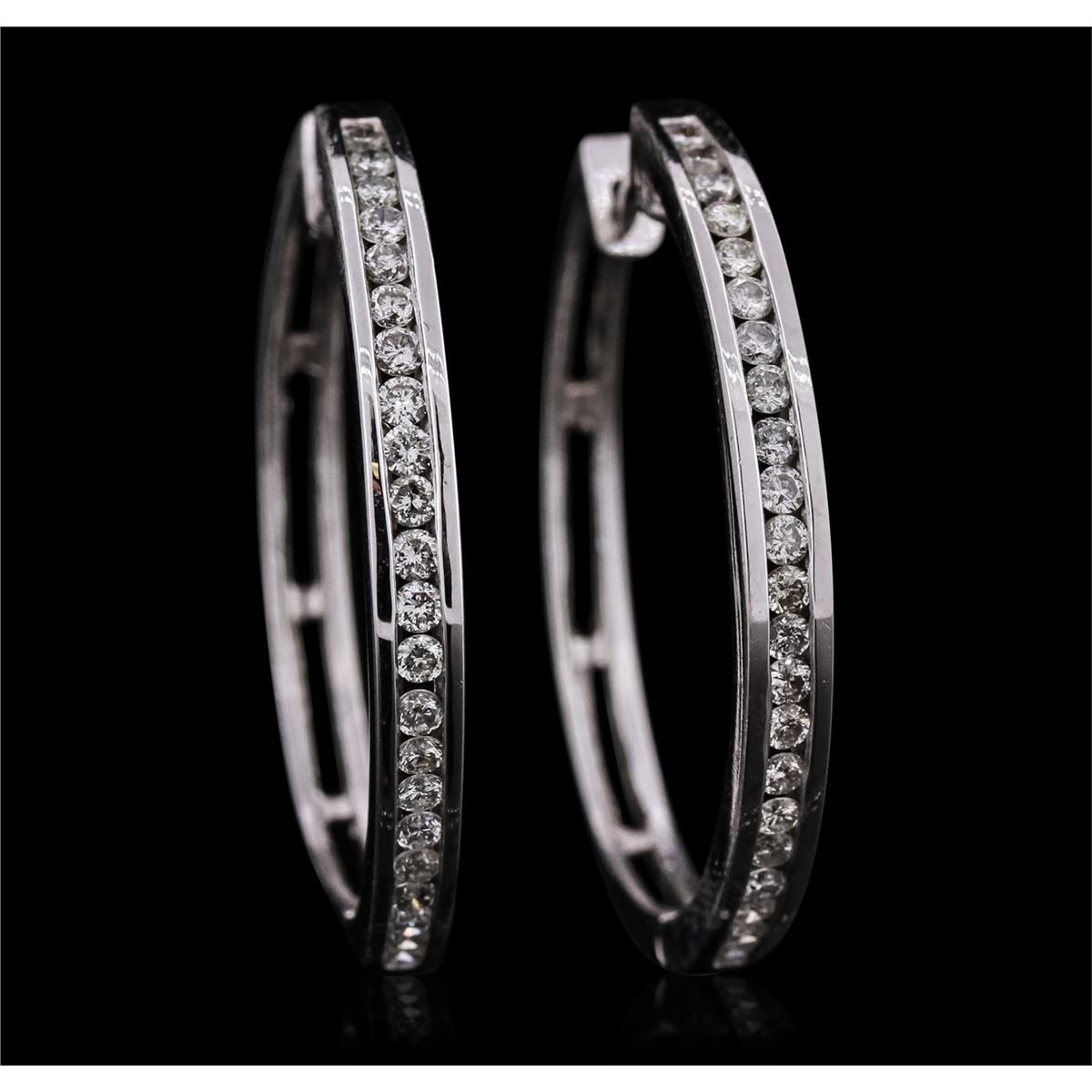 One electronically tested 14KT white gold Ladies cast hoop earrings with hinged clip backs with a bright polish finish. Condition is new. Containing: Forty-Four channel set round brilliant cut diamonds, measuring 1.80 - 1.80 x 1.08mm (depth est.) approximate. Total Weight of 44 Stones = 0.94ct. Clarity: I-1 to I-2. Color: I - J, Cut is Good. All diamonds are graded in the mounting, unless otherwise stated. Total Weight of Diamonds 0.94ct. Total Weight of Earrings 10.10 grams.. GGL Appraised at $5,305.00.