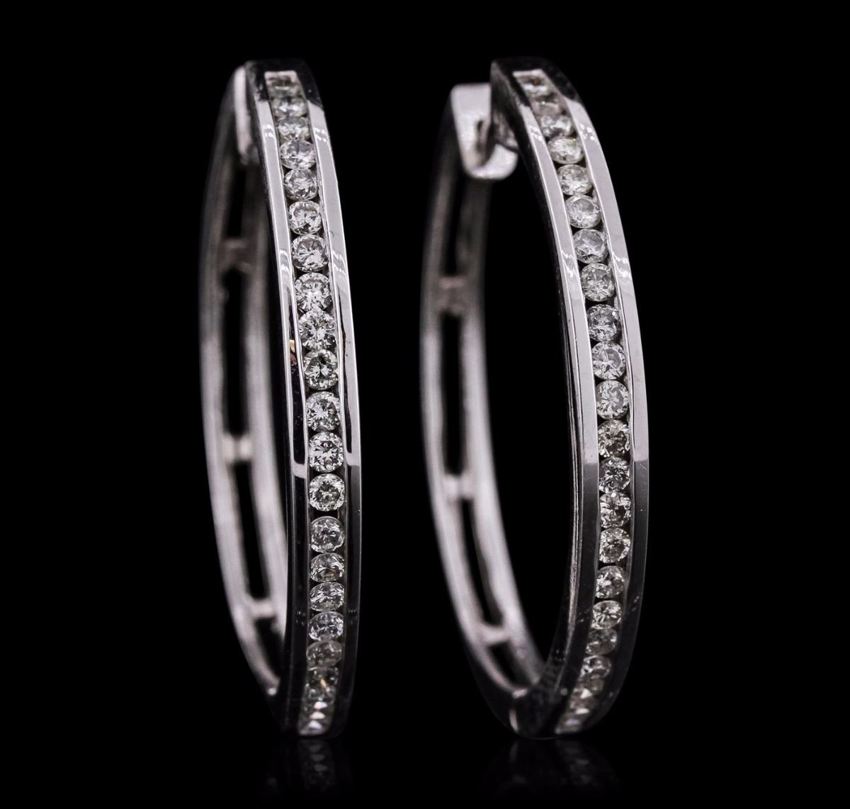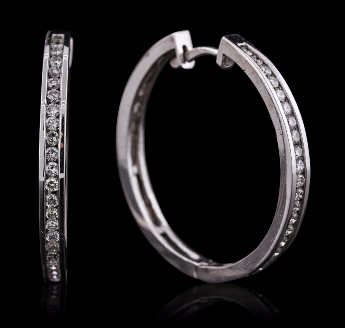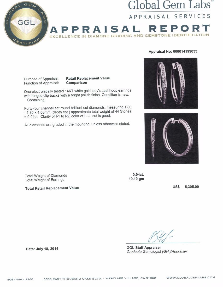 One electronically tested 14KT white gold Ladies cast hoop earrings with hinged clip backs with a bright polish finish. Condition is new. Containing: Forty-Four channel set round brilliant cut diamonds, measuring 1.80 - 1.80 x 1.08mm (depth est.) approximate. Total Weight of 44 Stones = 0.94ct. Clarity: I-1 to I-2. Color: I - J, Cut is Good. All diamonds are graded in the mounting, unless otherwise stated. Total Weight of Diamonds 0.94ct. Total Weight of Earrings 10.10 grams.. GGL Appraised at $5,305.00.