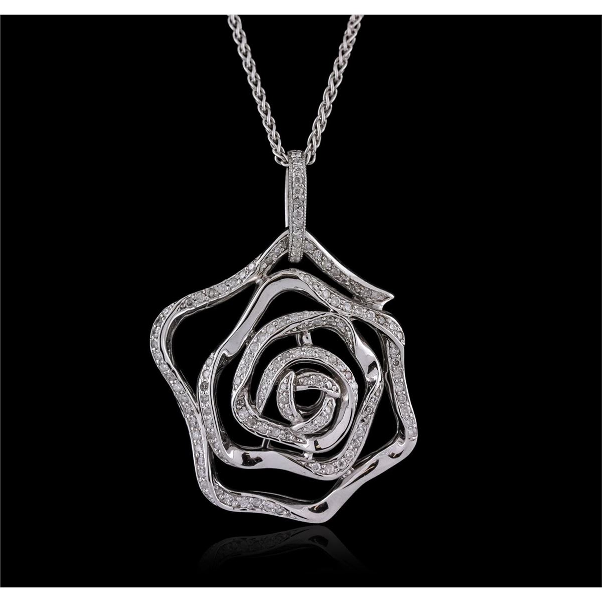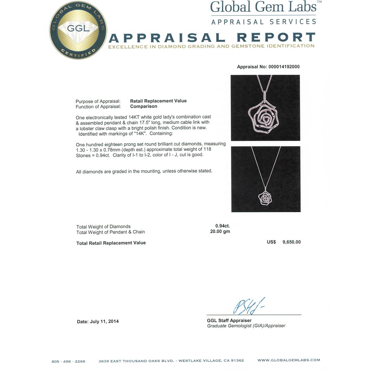 One electronically tested 14KT white gold Ladies combination cast & assembled pendant & chain 17.5" long, medium cable link with a lobster claw clasp with a bright polish finish. Condition is new. Identified with markings of "14K". Containing: One Hundred Eighteen prong set round brilliant cut diamonds, measuring 1.30 - 1.30 x 0.78mm (depth est.) approximate. Total Weight of 118 Stones = 0.94ct. Clarity: I-1 to I-2. Color: I - J, Cut is Good. All diamonds are graded in the mounting, unless otherwise stated. Total Weight of Diamonds 0.94ct. Total Weight of Pendant & Chain 20.00 grams. GGL Appraised at $9,650.00.