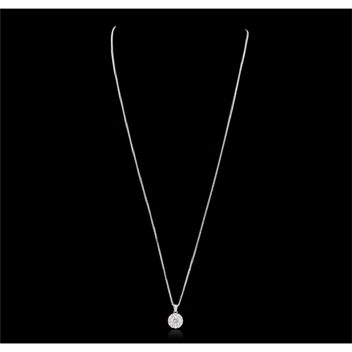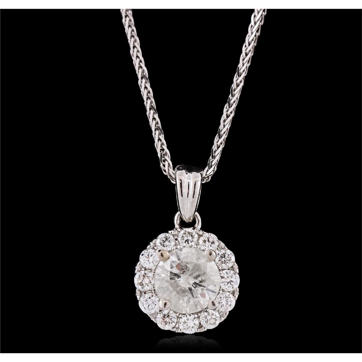 One electronically tested 14KT white gold ladies combination cast & assembled diamond pendant & chain 18.0" long, medium fancy cable with a lobster claw clasp with a bright polish finish. Identified with markings of "14K". Condition is new. Containing: One prong set round brilliant cut diamond, measuring 5.64 - 5.62 x 3.54mm (depth est.) approximate weight of 0.68ct. Clarity: I-3. Color: I, Cut is Good. Twelve prong set round brilliant cut diamonds, measuring 1.80 - 1.80 x 1.08mm (depth est.) approximate total weight of 12 Stones = 0.26ct. Clarity: SI-2 to I-2. Color: H - J, Cut is Good. All diamonds are graded in the mounting, unless otherwise stated. Total Weight of Diamonds 0.94ct. Total Weight of Pendant & Chain 2.70 grams. GGL Appraised at $3,165.00.