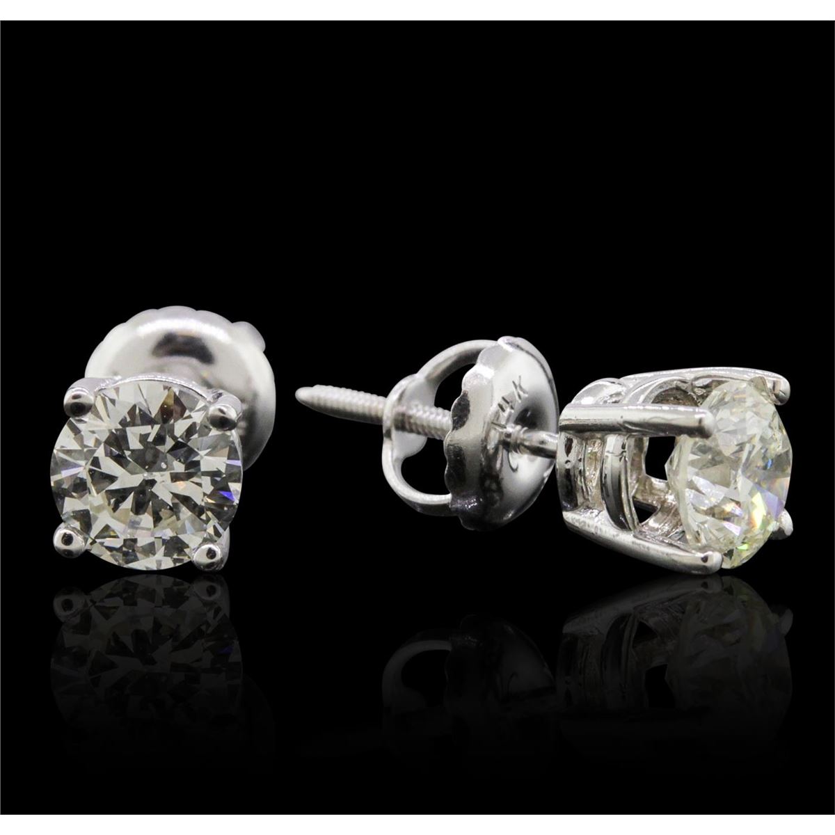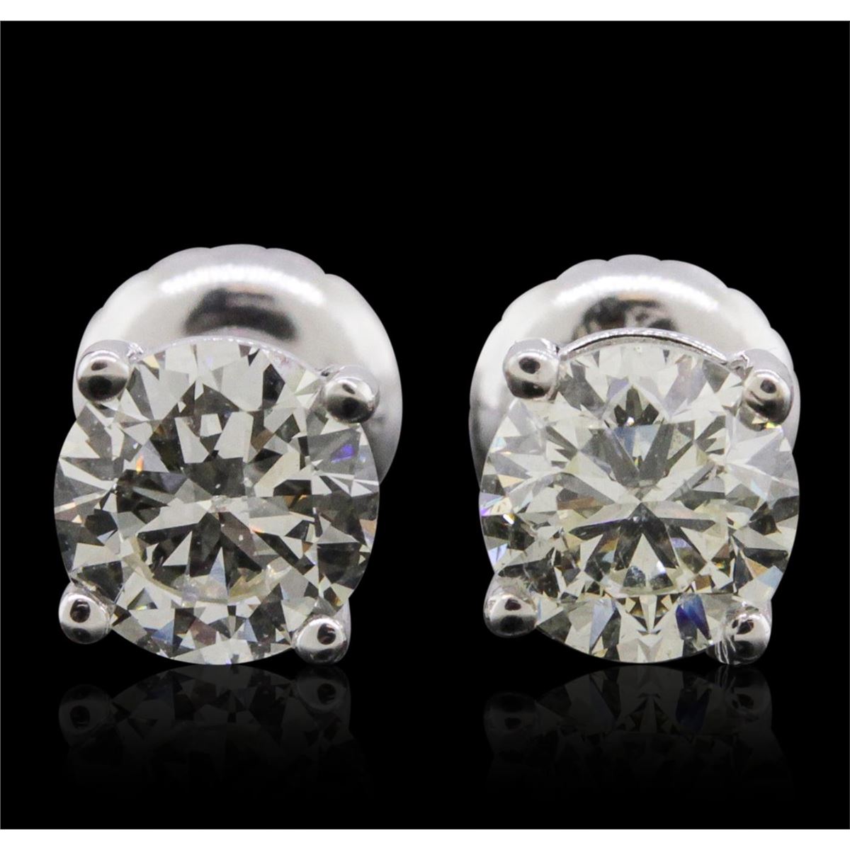 One pair electronically tested 14KT white gold cast & assembled diamond solitaire earrings with screw backs. Condition is new, good workmanship. Containing: One prong set round brilliant cut diamond, measuring 5.00 - 5.00 x 2.72mm (depth est.), 4.00% GTCF approximate weight of 0.44ct with a faint blue fluorescence. Graded in the setting. Clarity: SI-2. Depth: 54.4%. Table 65.0%. One prong set round brilliant cut diamond, measuring 5.00 - 5.00 x 3.20mm (depth est.), 3.00% GTCF approximate weight of 0.50ct. Graded in the setting. Clarity: SI-2. Depth: 64.0%. Table 55.6%. Total Weight of Diamonds 0.94ct. Total Weight of Earrings 1.01 grams. AIG Appraised at $3,100.00.
