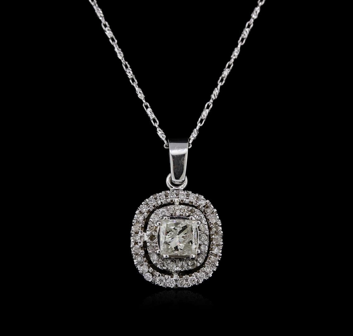 One electronically tested 14KT white gold ladies cast diamond pendant & chain 18.0" long, with a lobster claw clasp with a bright polish finish. Identified with markings of "14K". Condition is new. Containing: One prong set princess cut diamond, measuring 4.80 x 4.80 x 3.60mm (depth est.) approximate weight of 0.70ct. Clarity: I-2. Color: J, Cut is Good. Forty-Four prong set round brilliant cut diamonds, measuring 1.20 - 1.20 x 0.72mm (depth est.) approximate total weight of 44 Stones = 0.25ct. Clarity: I-1 to I-2. Color: I - J, Cut is Good. Diamonds are graded in the mounting, unless otherwise stated. Total Weight of Diamonds 0.95ct. Total Weight of Pendant & Chain 5.30 grams. GGL Appraised at $2,870.00.