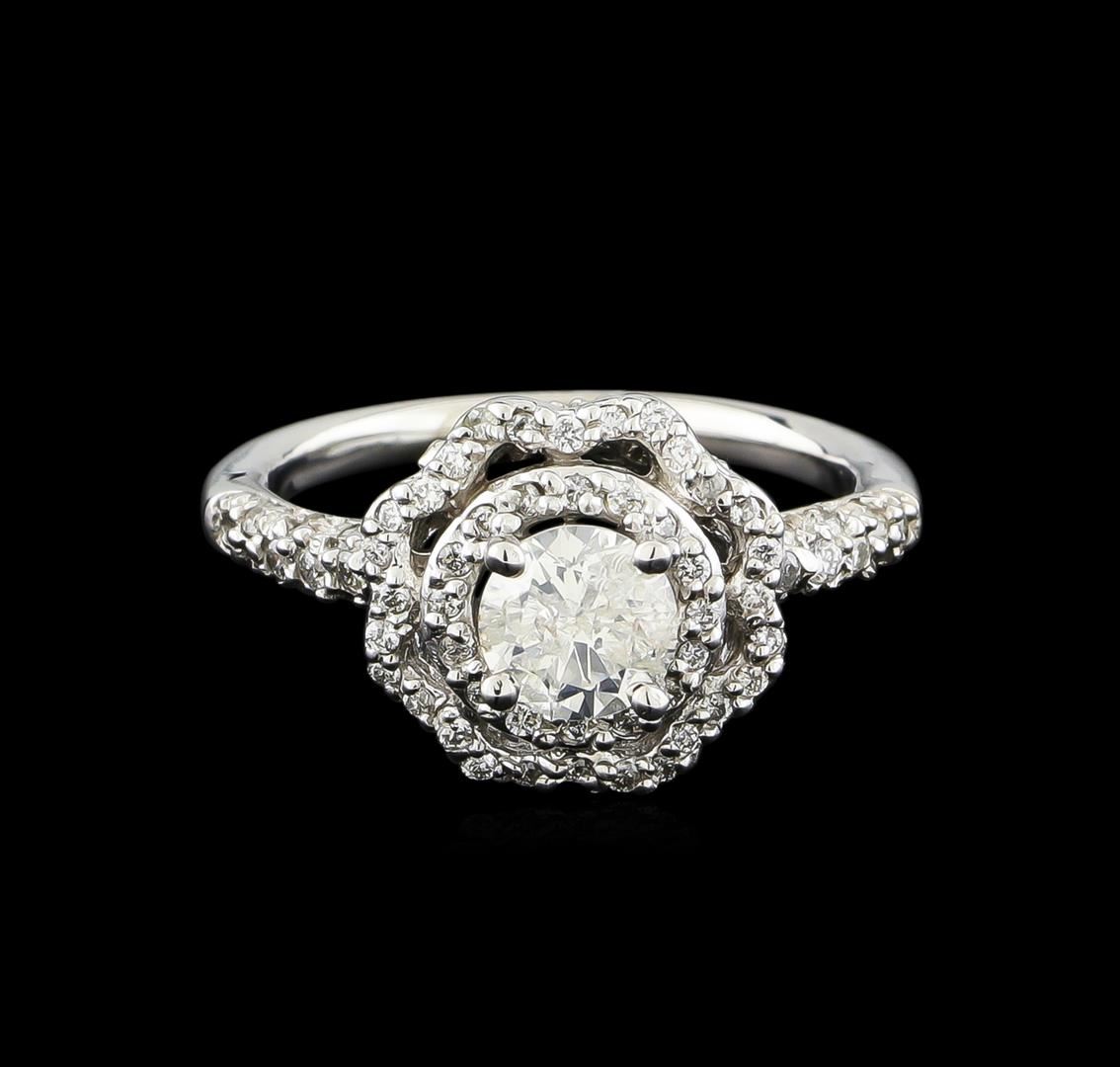 One electronically tested 14KT white gold ladies combination cast & assembled engagement ring with a flat shank with a bright polish finish. Identified with markings of "14K". Condition is new. Containing: One prong set round brilliant cut diamond, measuring 5.50 - 5.50 x 3.30mm (depth est.) approximate weight of 0.61ct. Clarity: I-2. Color: J, Cut is Good. Seventy prong set round brilliant cut diamonds, measuring 1.10 - 1.10 x 0.66mm (depth est.) approximate total weight of 70 Stones = 0.34ct. Clarity: I-1 to I-2. Color: I - J, Cut is Good. All diamonds are graded in the mounting, unless otherwise stated. Total Weight of Diamonds 0.95ct. Total Weight of Ring 3.50 grams. GGL Appraised at $4,755.00.