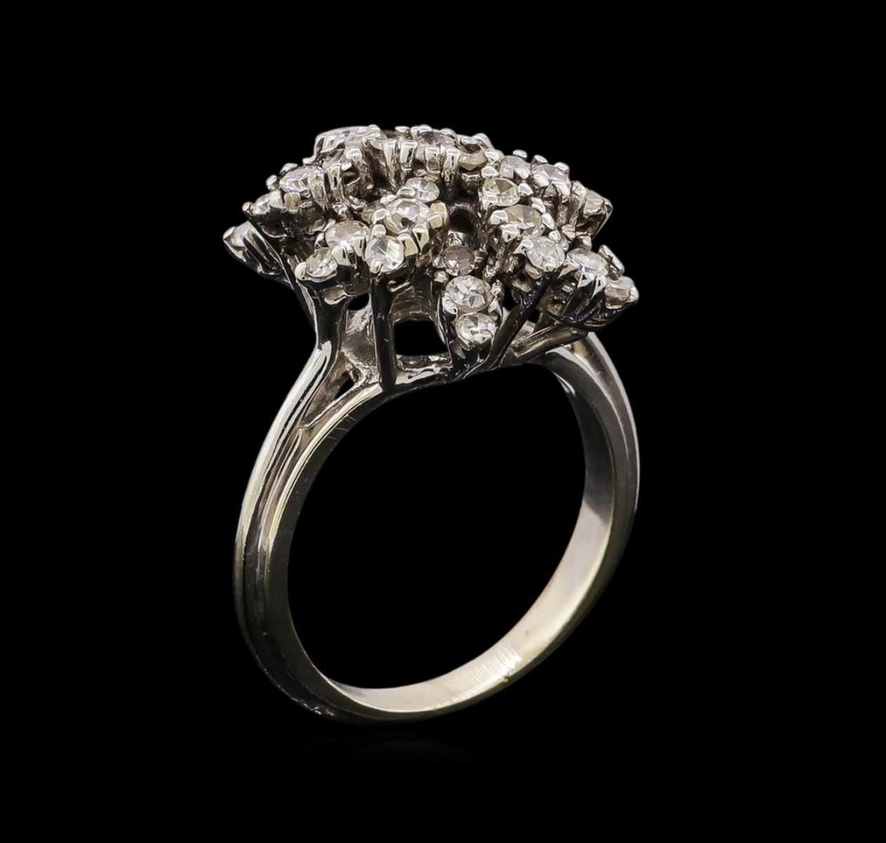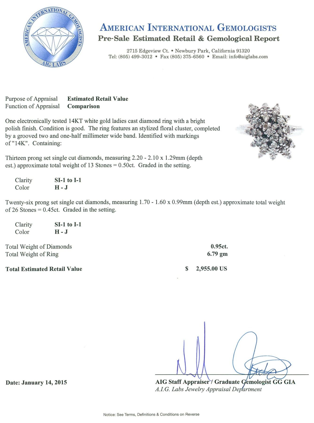 One electronically tested 14KT white gold ladies cast diamond ring with a bright polish finish. The ring features an stylized floral cluster, completed by a grooved two and one-half millimeter wide band. Identified with markings of "14K". Condition is good. Containing: Thirteen prong set single cut diamonds, measuring 2.20 - 2.10 x 1.29mm (depth est.) approximate total weight of 13 Stones = 0.50 ct. Graded in the setting. Clarity: SI-1 to I-1. Color: H - J Twenty-Six prong set single cut diamonds, measuring 1.70 - 1.60 x 0.99mm (depth est.) approximate total weight of 26 Stones = 0.45ct. Graded in the setting. Clarity: SI-1 to I-1. Color: H - J. Total Weight of Diamonds 0.95ct. Total Weight of Ring 6.79 grams. AIG Appraised.
