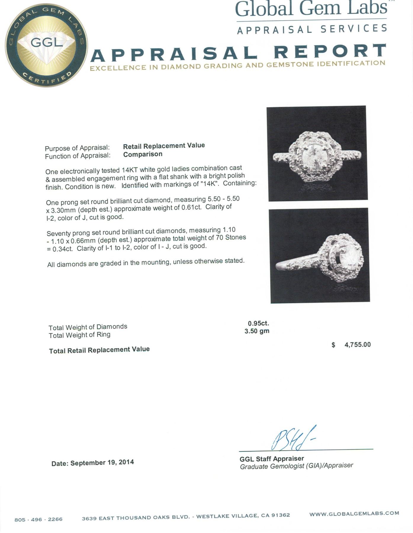 One electronically tested 14KT white gold ladies combination cast & assembled engagement ring with a flat shank with a bright polish finish. Identified with markings of "14K". Condition is new. Containing: One prong set round brilliant cut diamond, measuring 5.50 - 5.50 x 3.30mm (depth est.) approximate weight of 0.61ct. Clarity: I-2. Color: J, Cut is Good. Seventy prong set round brilliant cut diamonds, measuring 1.10 - 1.10 x 0.66mm (depth est.) approximate total weight of 70 Stones = 0.34ct. Clarity: I-1 to I-2. Color: I - J, Cut is Good. All diamonds are graded in the mounting, unless otherwise stated. Total Weight of Diamonds 0.95ct. Total Weight of Ring 3.50 grams. GGL Appraised.