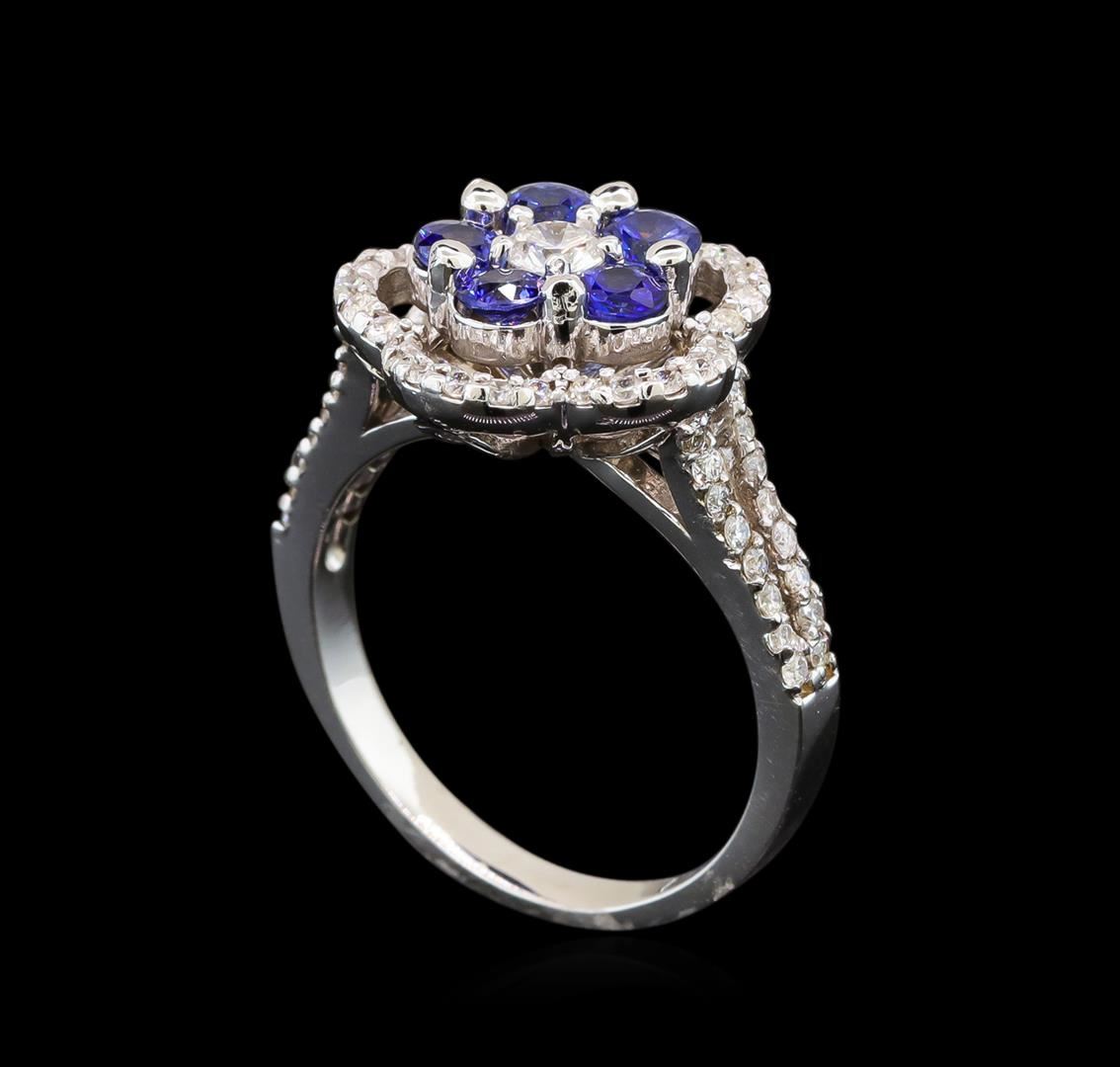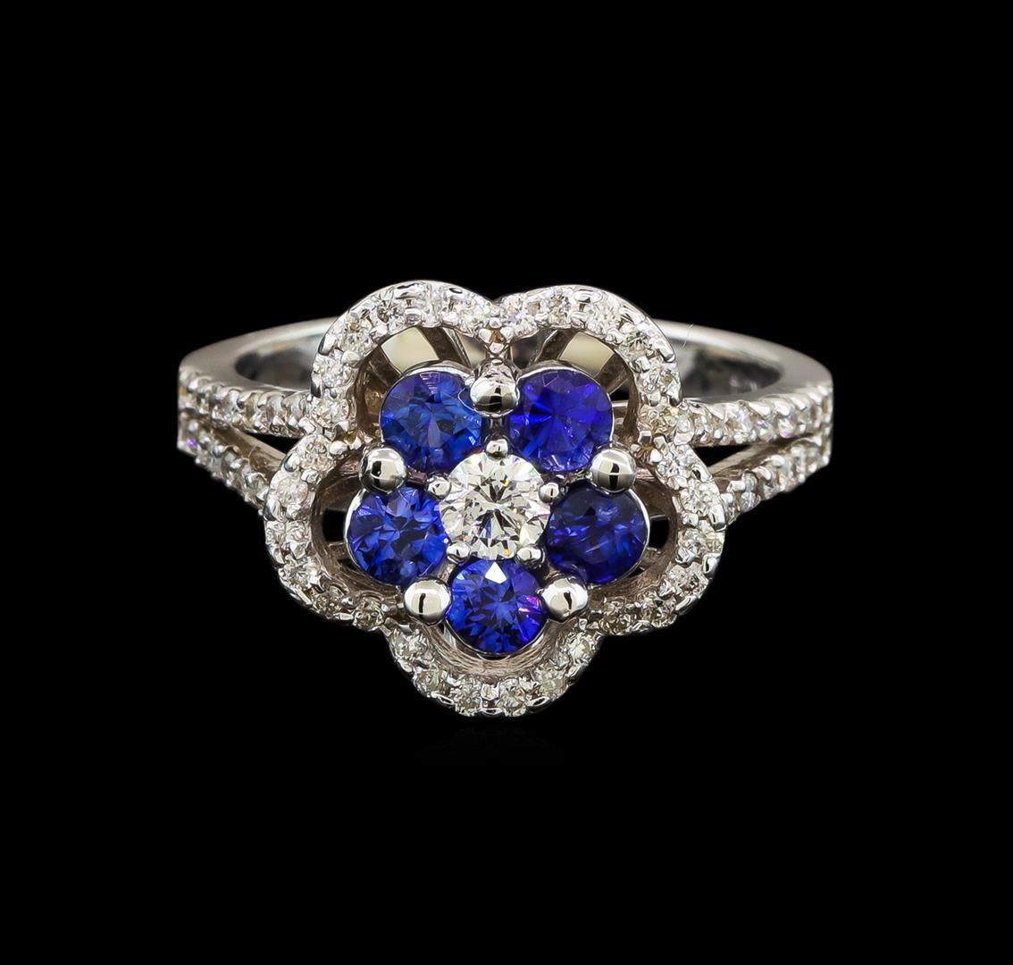 One electronically tested 14KT white gold ladies cast sapphire and diamond ring with a bright polish finish. Identified with markings of "K14". Condition is new. Containing: Five prong set round modified brilliant cut natural blue sapphires, measuring 3.30 - 3.30 x 2.15 mm, approximate total weight of 0.95ct., clarity is moderately included, type II, medium, moderately strong, blue color, (GIA B 5/4), cut is good. One prong set round brilliant cut diamond, measuring 3.50 - 3.50 x 2.10mm (depth est.) approximate weight of 0.16ct. Clarity: SI-1. Color: J, Cut is Good. Sixty-Two prong set round brilliant cut diamonds, measuring 1.20 - 1.20 x 0.72mm (depth est.) approximate total weight of 62 Stones = 0.39ct. Clarity: I-1 to I-2. Color: H - I, Cut is Good. Colored gemstones are presumed to have been subjected to commonly used enhancement processes. All diamonds and colored gemstones are graded in the mounting, unless otherwise stated. Total Weight of Colored Stones 0.95ct. Total Weight of Diamonds 0.55ct. Total Weight of Ring 5.00 grams. GGL Appraised at $2,560.00.