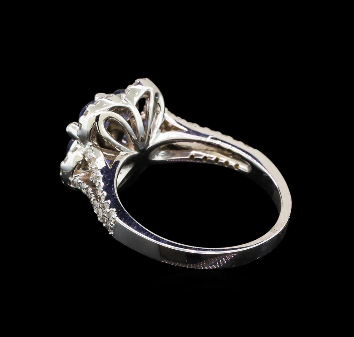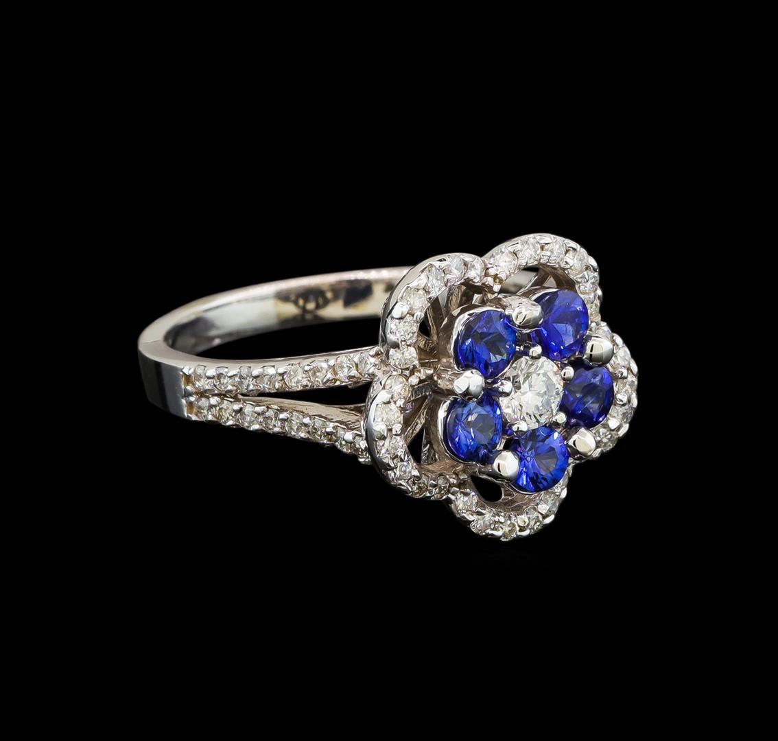 One electronically tested 14KT white gold ladies cast sapphire and diamond ring with a bright polish finish. Identified with markings of "K14". Condition is new. Containing: Five prong set round modified brilliant cut natural blue sapphires, measuring 3.30 - 3.30 x 2.15 mm, approximate total weight of 0.95ct., clarity is moderately included, type II, medium, moderately strong, blue color, (GIA B 5/4), cut is good. One prong set round brilliant cut diamond, measuring 3.50 - 3.50 x 2.10mm (depth est.) approximate weight of 0.16ct. Clarity: SI-1. Color: J, Cut is Good. Sixty-Two prong set round brilliant cut diamonds, measuring 1.20 - 1.20 x 0.72mm (depth est.) approximate total weight of 62 Stones = 0.39ct. Clarity: I-1 to I-2. Color: H - I, Cut is Good. Colored gemstones are presumed to have been subjected to commonly used enhancement processes. All diamonds and colored gemstones are graded in the mounting, unless otherwise stated. Total Weight of Colored Stones 0.95ct. Total Weight of Diamonds 0.55ct. Total Weight of Ring 5.00 grams. GGL Appraised at $2,560.00.