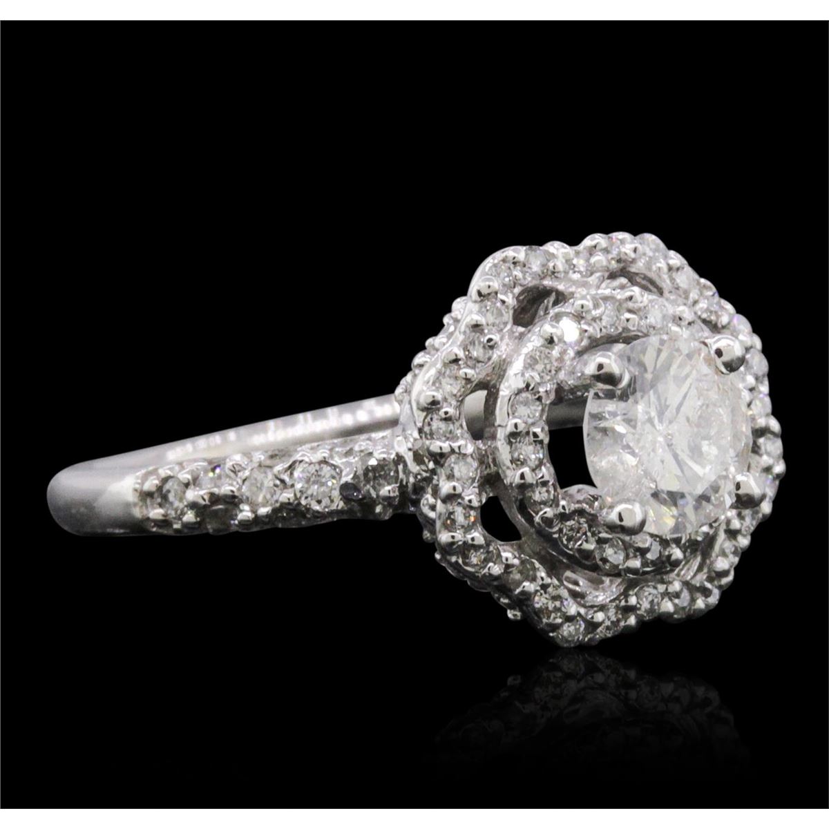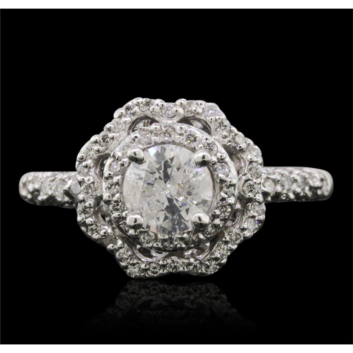 One electronically tested 14KT white gold ladies combination cast & assembled engagement ring with a flat shank with a bright polish finish. Identified with markings of "14K". Condition is new. Containing: One prong set round brilliant cut diamond, measuring 5.50 - 5.50 x 3.30mm (depth est.) approximate weight of 0.61ct. Clarity: I-2. Color: J, Cut is Good. Seventy prong set round brilliant cut diamonds, measuring 1.10 - 1.10 x 0.66mm (depth est.) approximate total weight of 70 Stones = 0.34ct. Clarity: I-1 to I-2. Color: I - J, Cut is Good. All diamonds are graded in the mounting, unless otherwise stated. Total Weight of Diamonds 0.95ct. Total Weight of Ring 3.50 grams. GGL Appraised at $4,755.00.