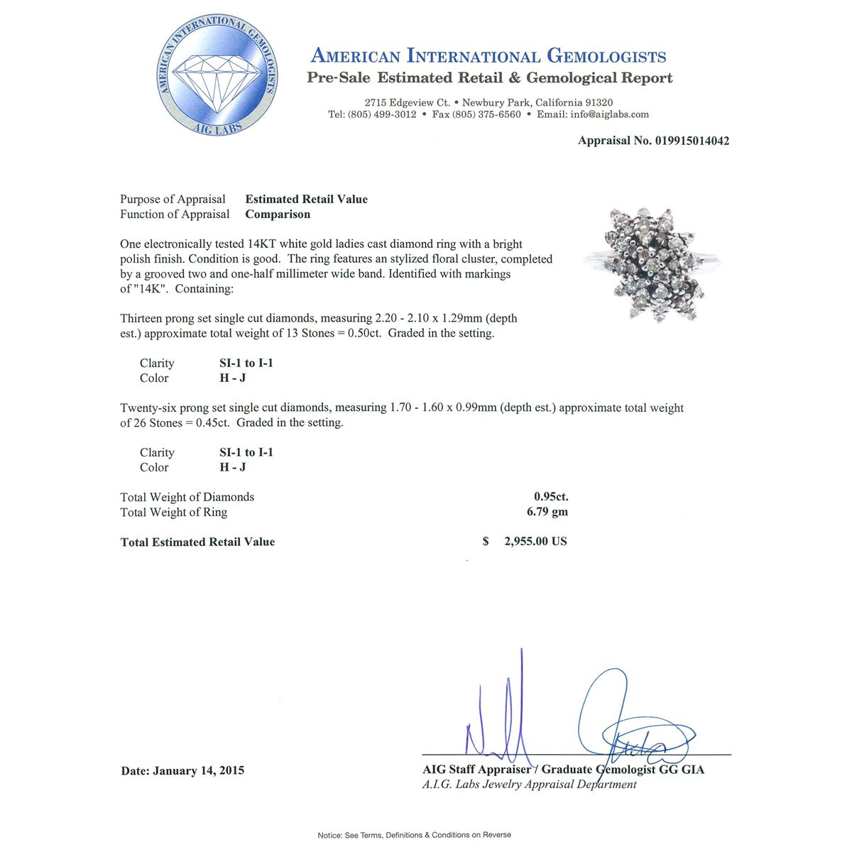 One electronically tested 14KT white gold ladies cast diamond ring with a bright polish finish. The ring features an stylized floral cluster, completed by a grooved two and one-half millimeter wide band. Identified with markings of "14K". Condition is good. Containing: Thirteen prong set single cut diamonds, measuring 2.20 - 2.10 x 1.29mm (depth est.) approximate total weight of 13 Stones = 0.50ct. Graded in the setting. Clarity: SI-1 to I-1. Color: H - J Twenty-Six prong set single cut diamonds, measuring 1.70 - 1.60 x 0.99mm (depth est.) approximate total weight of 26 Stones = 0.45ct. Graded in the setting. Clarity: SI-1 to I-1. Color: H - J. Total Weight of Diamonds 0.95ct. Total Weight of Ring 6.79 grams. AIG Appraised at $2,955.00.