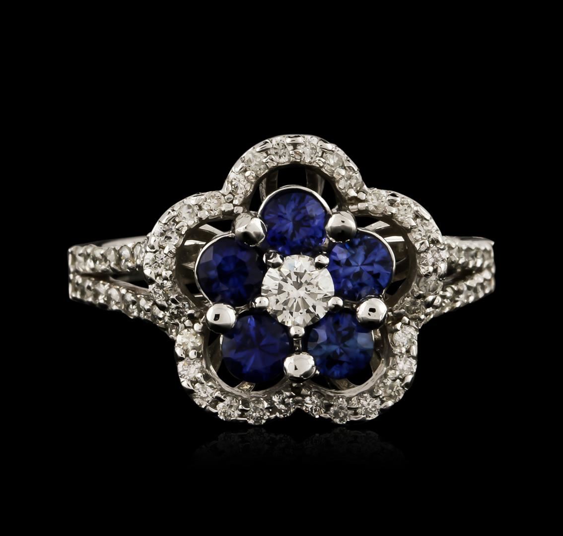 One electronically tested 14KT white gold ladies cast sapphire and diamond ring with a bright polish finish. Identified with markings of "K14". Condition is new. Containing: Five prong set round modified brilliant cut natural blue sapphires, measuring 3.30 - 3.30 x 2.15 mm, approximate total weight of 0.95ct., clarity is moderately included, type II, medium, moderately strong, blue color, (GIA B 5/4), cut is good. One prong set round brilliant cut diamond, measuring 3.50 - 3.50 x 2.10mm (depth est.) approximate weight of 0.16ct. Clarity: SI-1. Color: J, Cut is Good. Sixty-Two prong set round brilliant cut diamonds, measuring 1.20 - 1.20 x 0.72mm (depth est.) approximate total weight of 62 Stones = 0.39ct. Clarity: I-1 to I-2. Color: H - I, Cut is Good. Colored gemstones are presumed to have been subjected to commonly used enhancement processes. All diamonds and colored gemstones are graded in the mounting, unless otherwise stated. Total Weight of Colored Stones 0.95ct. Total Weight of Diamonds 0.55ct. Total Weight of Ring 5.00 grams. GGL Appraised at $2,560.00.
