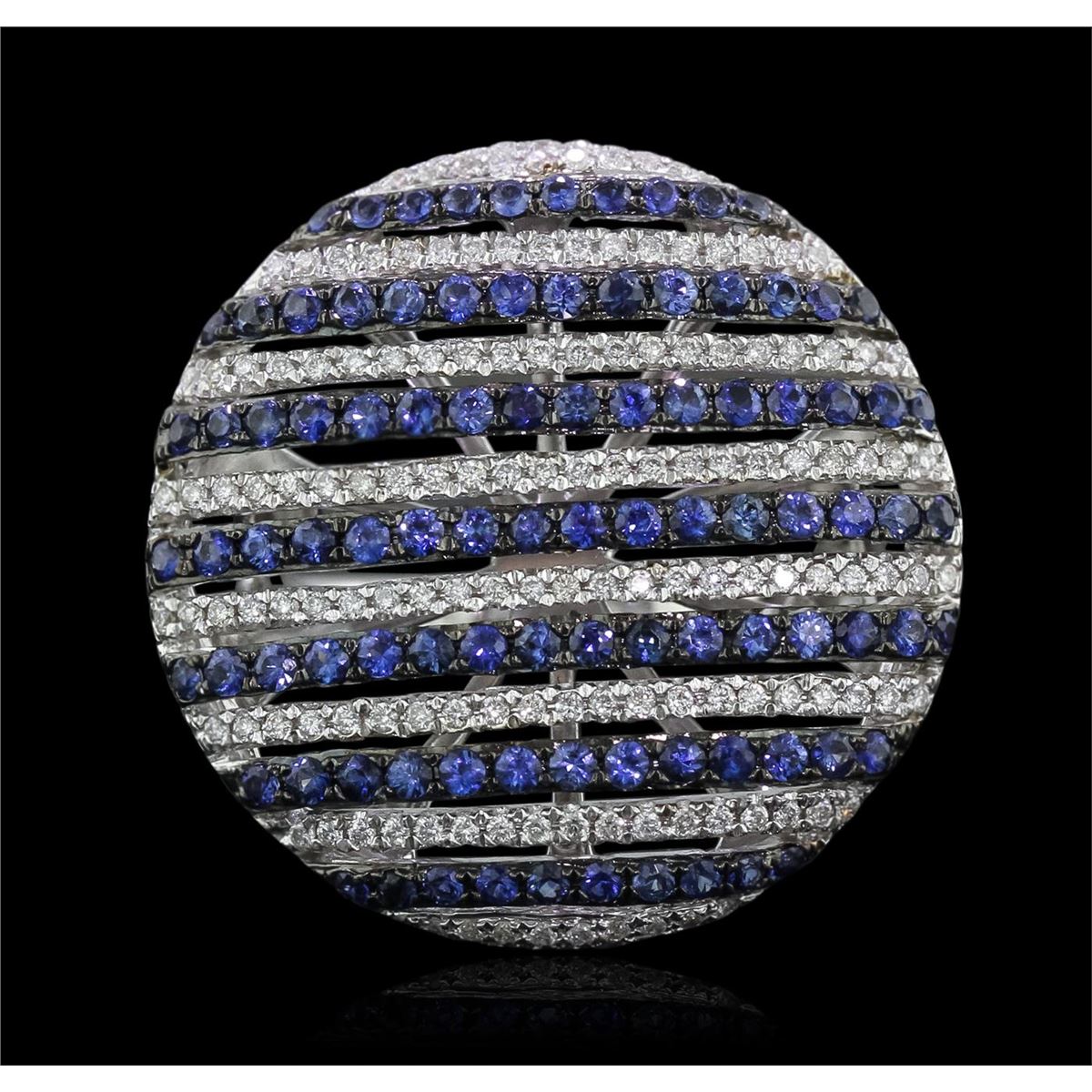 One electronically tested 14KT white gold Ladies combination cast & assembled ring with a bright polish finish. Condition is new. Identified with markings of "585". Containing: Ninety-five prong set round modified brilliant cut natural blue sapphires, measuring 1.30 - 1.30 x 0.85 mm, approximate. Total Weight of 0.95ct., clarity is slightly included, type II, medium dark, moderately strong, blue color, (GIA B 6/4), cut is good. Colored gemstones are presumed to have been subjected to commonly used color/clarity enhancement processes. One Hundred Fifty-Two prong set round brilliant cut diamonds, measuring 1.00 - 1.00 x 0.60mm (depth est.) approximate. Total Weight of 152 Stones = 0.55ct. Clarity: I-1 to I-2. Color: J - K, Cut is Good. Total Weight of Colored Stones 0.95ct. Total Weight of Diamonds 0.55ct. Total Weight of Ring 7.70 grams. GGL Appraised at $6,040.00.
