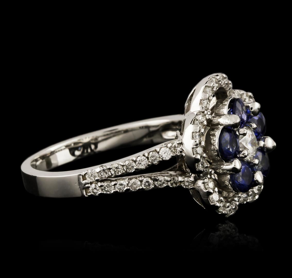 One electronically tested 14KT white gold ladies cast sapphire and diamond ring with a bright polish finish. Identified with markings of "K14". Condition is new. Containing: Five prong set round modified brilliant cut natural blue sapphires, measuring 3.30 - 3.30 x 2.15 mm, approximate total weight of 0.95ct., clarity is moderately included, type II, medium, moderately strong, blue color, (GIA B 5/4), cut is good. One prong set round brilliant cut diamond, measuring 3.50 - 3.50 x 2.10mm (depth est.) approximate weight of 0.16ct. Clarity: SI-1. Color: J, Cut is Good. Sixty-Two prong set round brilliant cut diamonds, measuring 1.20 - 1.20 x 0.72mm (depth est.) approximate total weight of 62 Stones = 0.39ct. Clarity: I-1 to I-2. Color: H - I, Cut is Good. Colored gemstones are presumed to have been subjected to commonly used enhancement processes. All diamonds and colored gemstones are graded in the mounting, unless otherwise stated. Total Weight of Colored Stones 0.95ct. Total Weight of Diamonds 0.55ct. Total Weight of Ring 5.00 grams. GGL Appraised at $2,560.00.