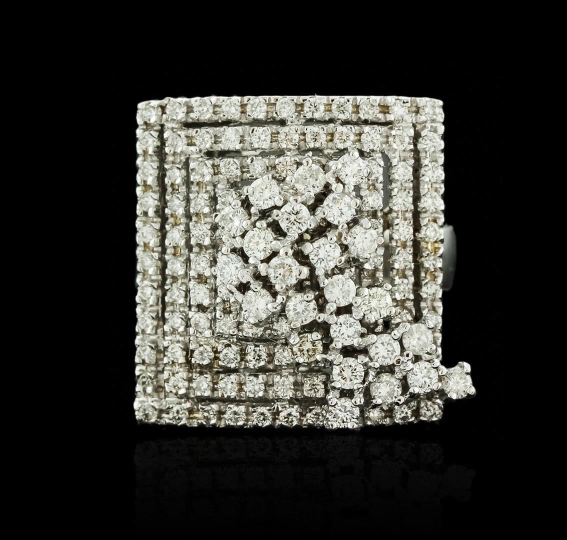 One electronically tested 14KT white gold ladies cast diamond ring with a bright polish finish. Identified with markings of "K14". Condition is new. Containing: Ninety-Four prong set round brilliant cut diamonds, measuring 1.10 - 1.10 x 0.66mm (depth est.) approximate total weight of 94 Stones = 0.45ct. Clarity: SI-1 to SI-2. Color: H - I, Cut is Good. Twenty-Four prong set round brilliant cut diamonds, measuring 1.80 - 1.80 x 1.08mm (depth est.) approximate total weight of 24 Stones = 0.51ct. Clarity: SI-1 to SI-2. Color: H - I, Cut is Good. All diamonds are graded in the mounting, unless otherwise stated. Total Weight of Diamonds 0.96ct. Total Weight of Ring 14.10 grams. GGL Appraised at $6,610.00.