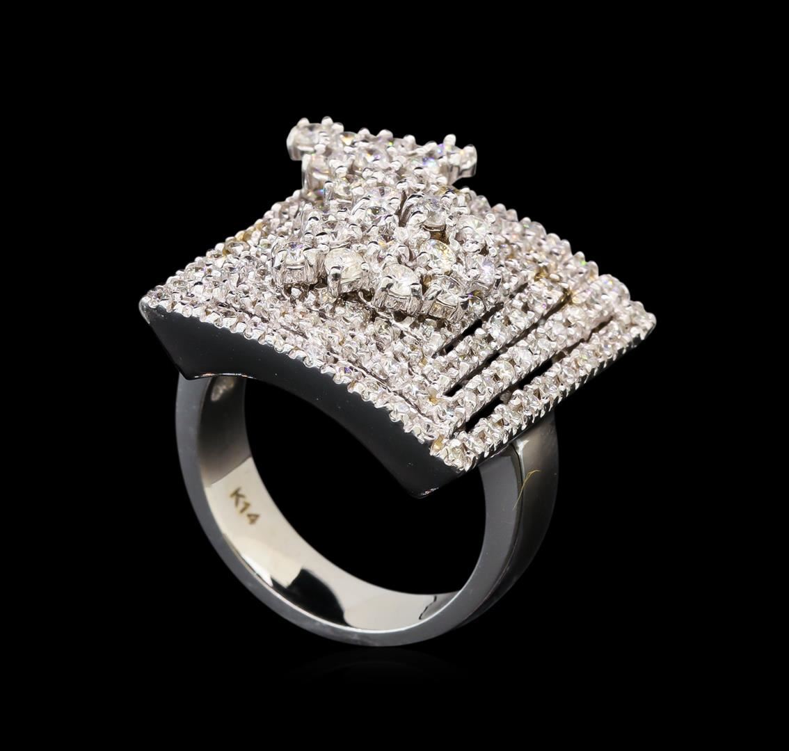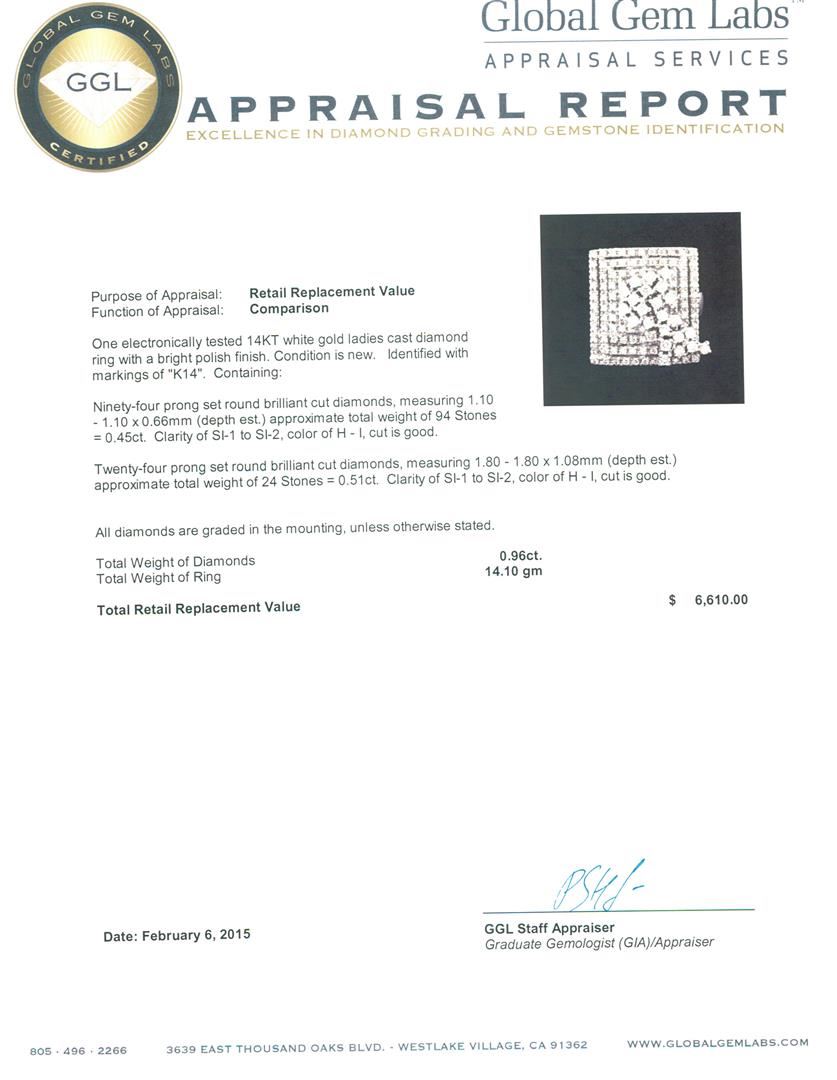 One electronically tested 14KT white gold ladies cast diamond ring with a bright polish finish. Identified with markings of "K14". Condition is new. Containing: Ninety-Four prong set round brilliant cut diamonds, measuring 1.10 - 1.10 x 0.66mm (depth est.) approximate total weight of 94 Stones = 0.45ct. Clarity: SI-1 to SI-2. Color: H - I, Cut is Good. Twenty-Four prong set round brilliant cut diamonds, measuring 1.80 - 1.80 x 1.08mm (depth est.) approximate total weight of 24 Stones = 0.51ct. Clarity: SI-1 to SI-2. Color: H - I, Cut is Good. All diamonds are graded in the mounting, unless otherwise stated. Total Weight of Diamonds 0.96ct. Total Weight of Ring 14.10 grams. GGL Appraised at $6,610.00.