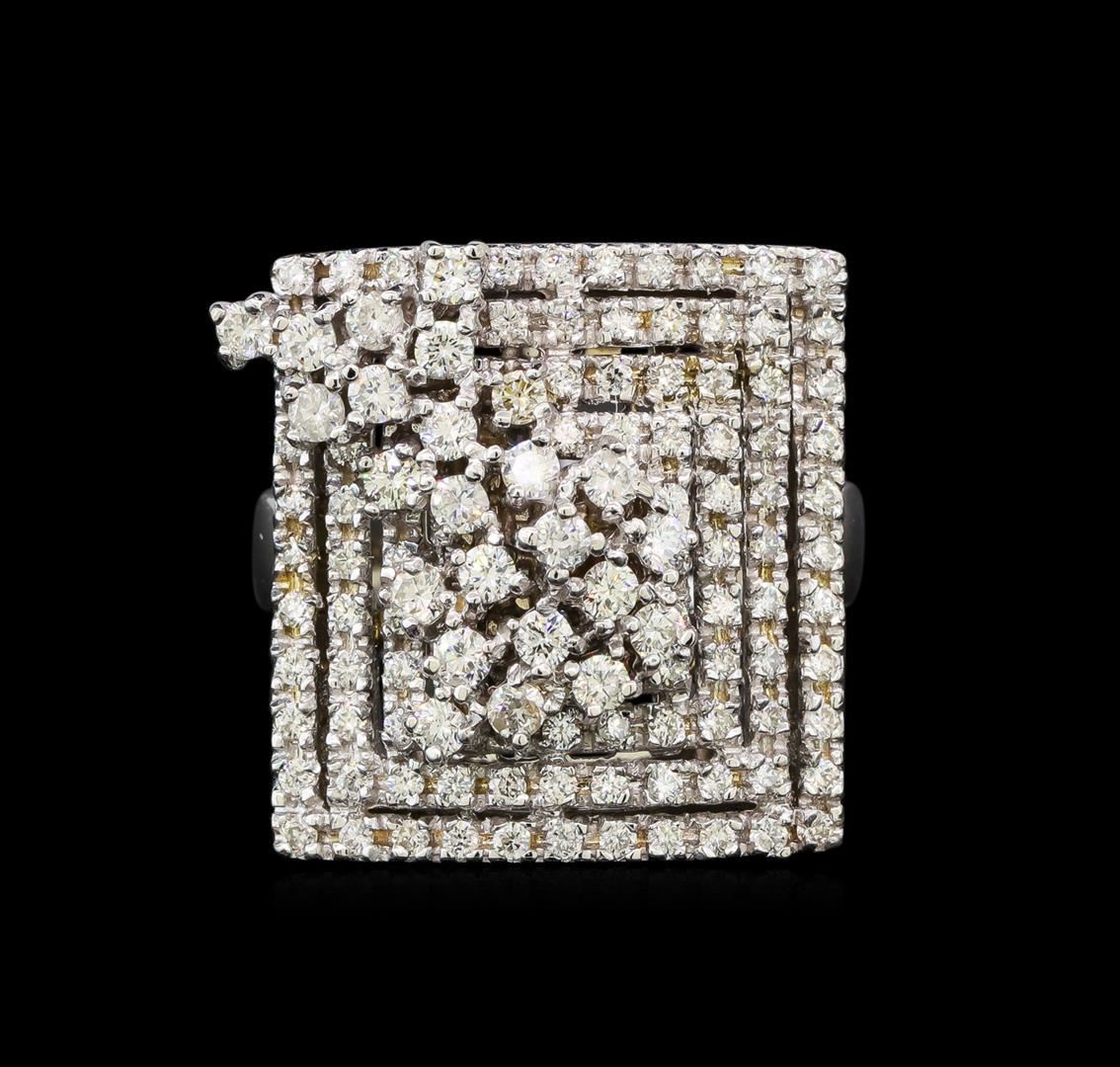 One electronically tested 14KT white gold ladies cast diamond ring with a bright polish finish. Identified with markings of "K14". Condition is new. Containing: Ninety-Four prong set round brilliant cut diamonds, measuring 1.10 - 1.10 x 0.66mm (depth est.) approximate total weight of 94 Stones = 0.45ct. Clarity: SI-1 to SI-2. Color: H - I, Cut is Good. Twenty-Four prong set round brilliant cut diamonds, measuring 1.80 - 1.80 x 1.08mm (depth est.) approximate total weight of 24 Stones = 0.51ct. Clarity: SI-1 to SI-2. Color: H - I, Cut is Good. All diamonds are graded in the mounting, unless otherwise stated. Total Weight of Diamonds 0.96ct. Total Weight of Ring 14.10 grams. GGL Appraised at $6,610.00.