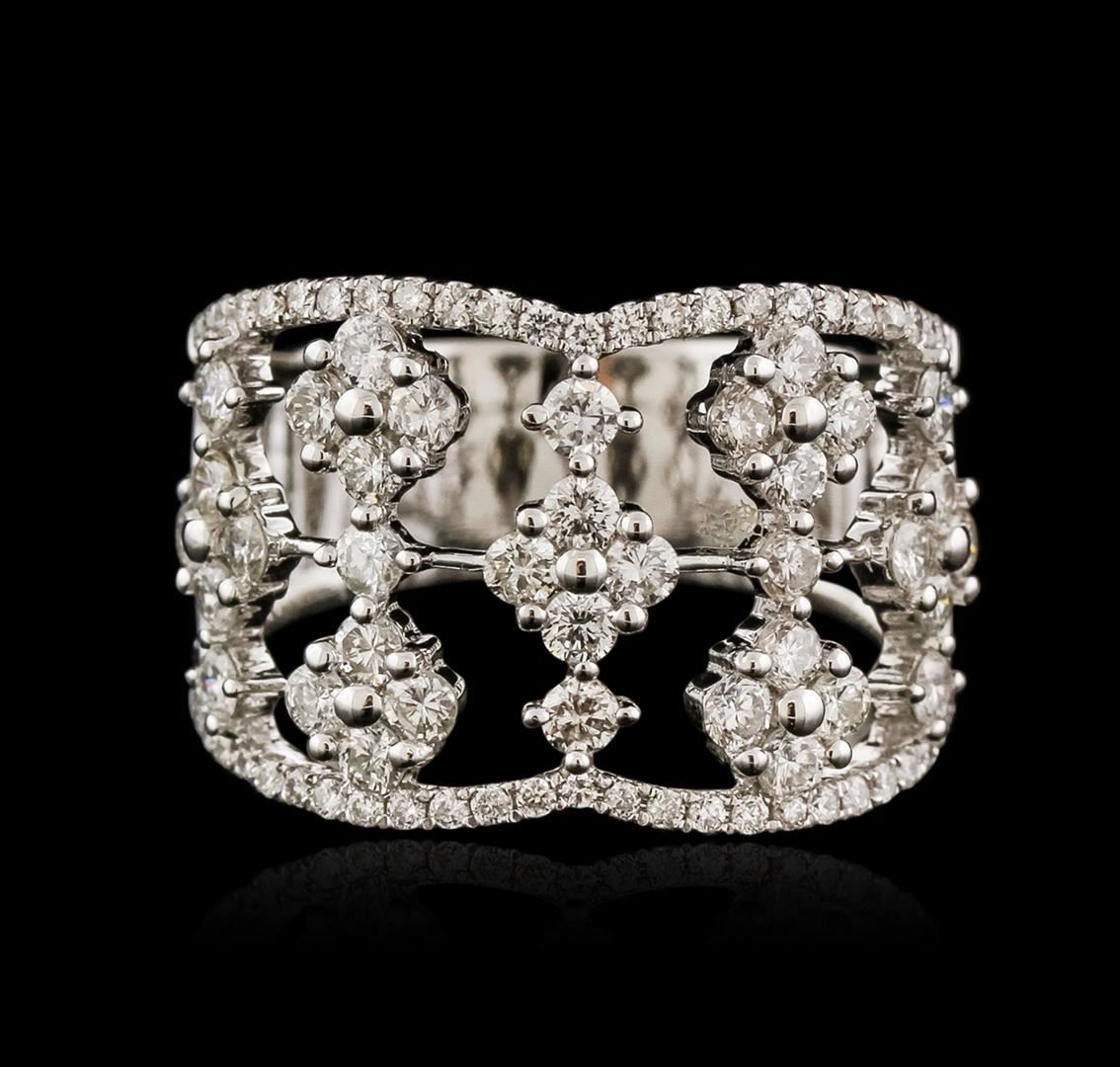 One electronically tested 14KT white gold ladies cast diamond ring with a tapered shank with a bright polish finish. Identified with markings of "14K". Condition is new. Containing: Thirty-Six prong set round brilliant cut diamonds, measuring 1.80 - 1.70 x 1.05mm (depth est.) approximate total weight of 36 Stones = 0.71ct. Clarity: VS-2 to SI-1. Color: I - J, Cut is Good. Fifty-Two prong set round brilliant cut diamonds, measuring 1.10 - 1.10 x 0.66mm (depth est.) approximate total weight of 52 Stones = 0.25ct. Clarity: I-1. Color: I - J, Cut is Good. All diamonds are graded in the mounting, unless otherwise stated. Total Weight of Diamonds 0.96ct. Total Weight of Ring 5.90 grams. GGL Appraised at $3,695.00.