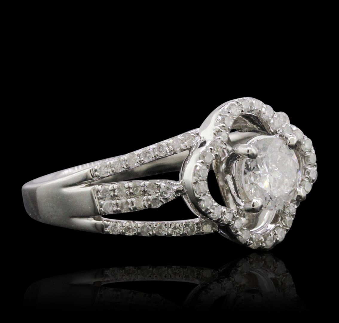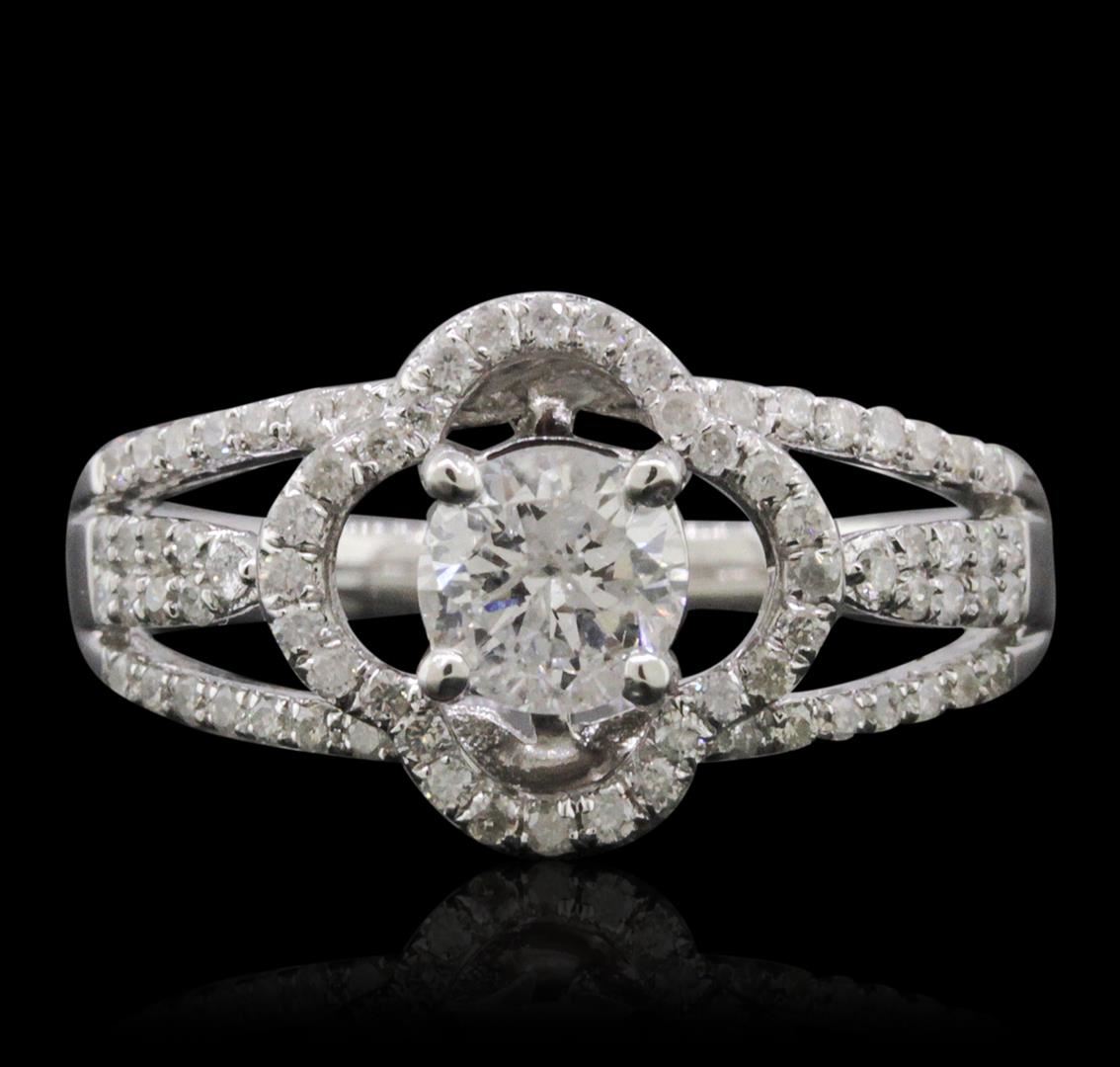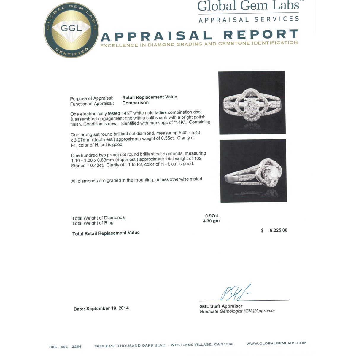 One electronically tested 14KT white gold ladies combination cast & assembled engagement ring with a split shank with a bright polish finish. Identified with markings of "14K". Condition is new. Containing: One prong set round brilliant cut diamond, measuring 5.40 - 5.40 x 3.07mm (depth est.) approximate weight of 0.55ct. Clarity: I-1. Color: H, Cut is Good. One Hundred Two prong set round brilliant cut diamonds, measuring 1.10 - 1.00 x 0.63mm (depth est.) approximate total weight of 102 Stones = 0.43ct. Clarity: I-1 to I-2. Color: H - I, Cut is Good. All diamonds are graded in the mounting, unless otherwise stated. Total Weight of Diamonds 0.97ct. Total Weight of Ring 4.30 grams. GGL Appraised at $6,225.00.