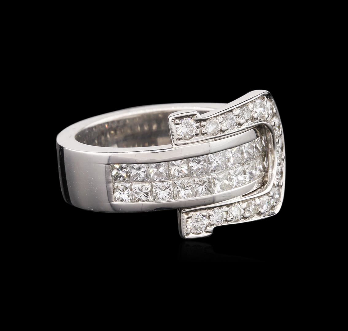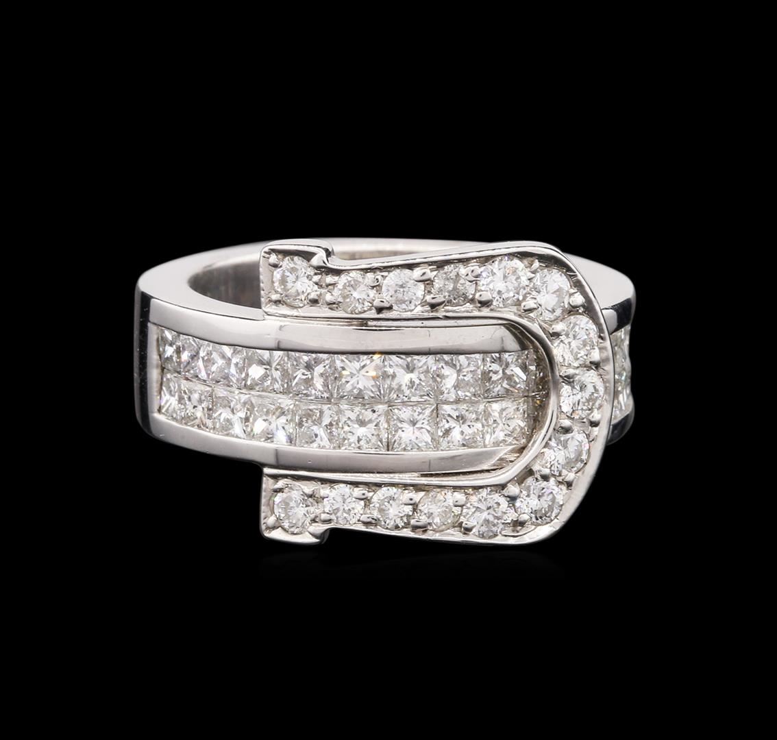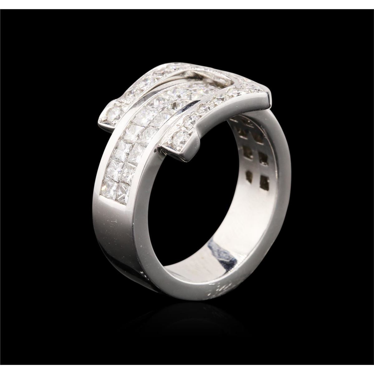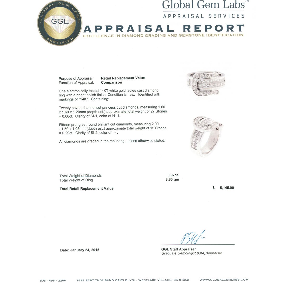 One electronically tested 14KT white gold ladies cast diamond ring with a bright polish finish. Identified with markings of "14K". Condition is new. Containing: Twenty-Seven channel set princess cut diamonds, measuring 1.60 x 1.60 x 1.20mm (depth est.) approximate total weight of 27 Stones = 0.68ct. Clarity: SI-1. Color: H - I. Fifteen prong set round brilliant cut diamonds, measuring 2.00. - 1.50 x 1.05mm (depth est.) approximate total weight of 15 Stones = 0.29ct. Clarity: SI-2. Color: I - J. All diamonds are graded in the mounting, unless otherwise stated. Total Weight of Diamonds 0.97ct. Total Weight of Ring 8.80 grams. GGL Appraised at $5,145.00.