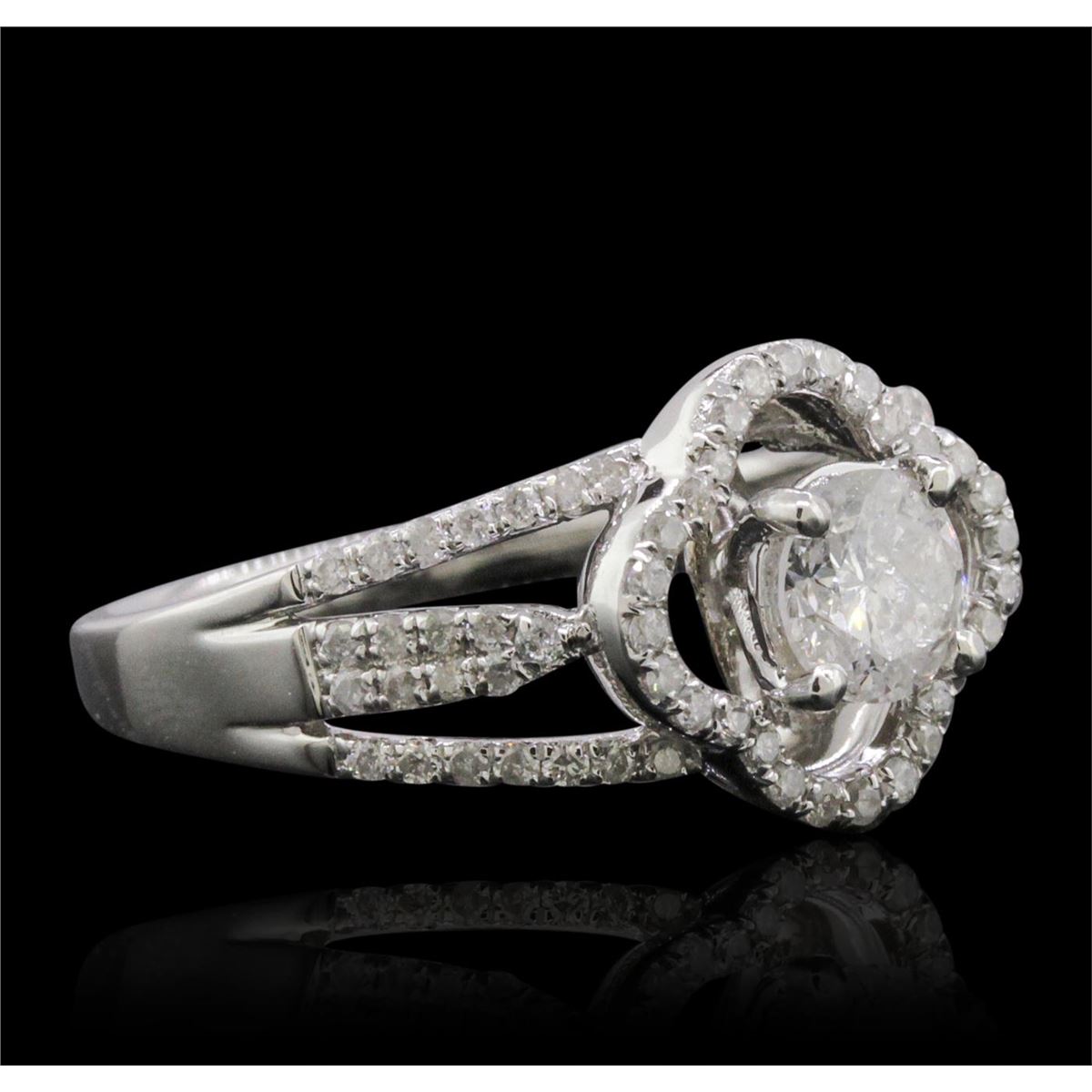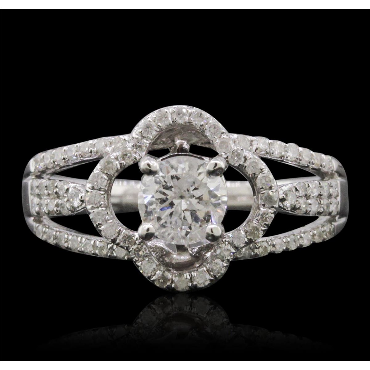 One electronically tested 14KT white gold ladies combination cast & assembled engagement ring with a split shank with a bright polish finish. Identified with markings of "14K". Condition is new. Containing: One prong set round brilliant cut diamond, measuring 5.40 - 5.40 x 3.07mm (depth est.) approximate weight of 0.55ct. Clarity: I-1. Color: H, Cut is Good. One Hundred Two prong set round brilliant cut diamonds, measuring 1.10 - 1.00 x 0.63mm (depth est.) approximate total weight of 102 Stones = 0.43ct. Clarity: I-1 to I-2. Color: H - I, Cut is Good. All diamonds are graded in the mounting, unless otherwise stated. Total Weight of Diamonds 0.97ct. Total Weight of Ring 4.30 grams. GGL Appraised at $6,225.00.