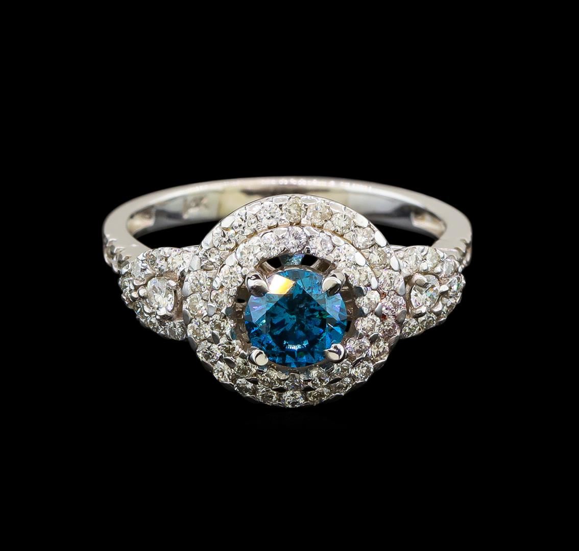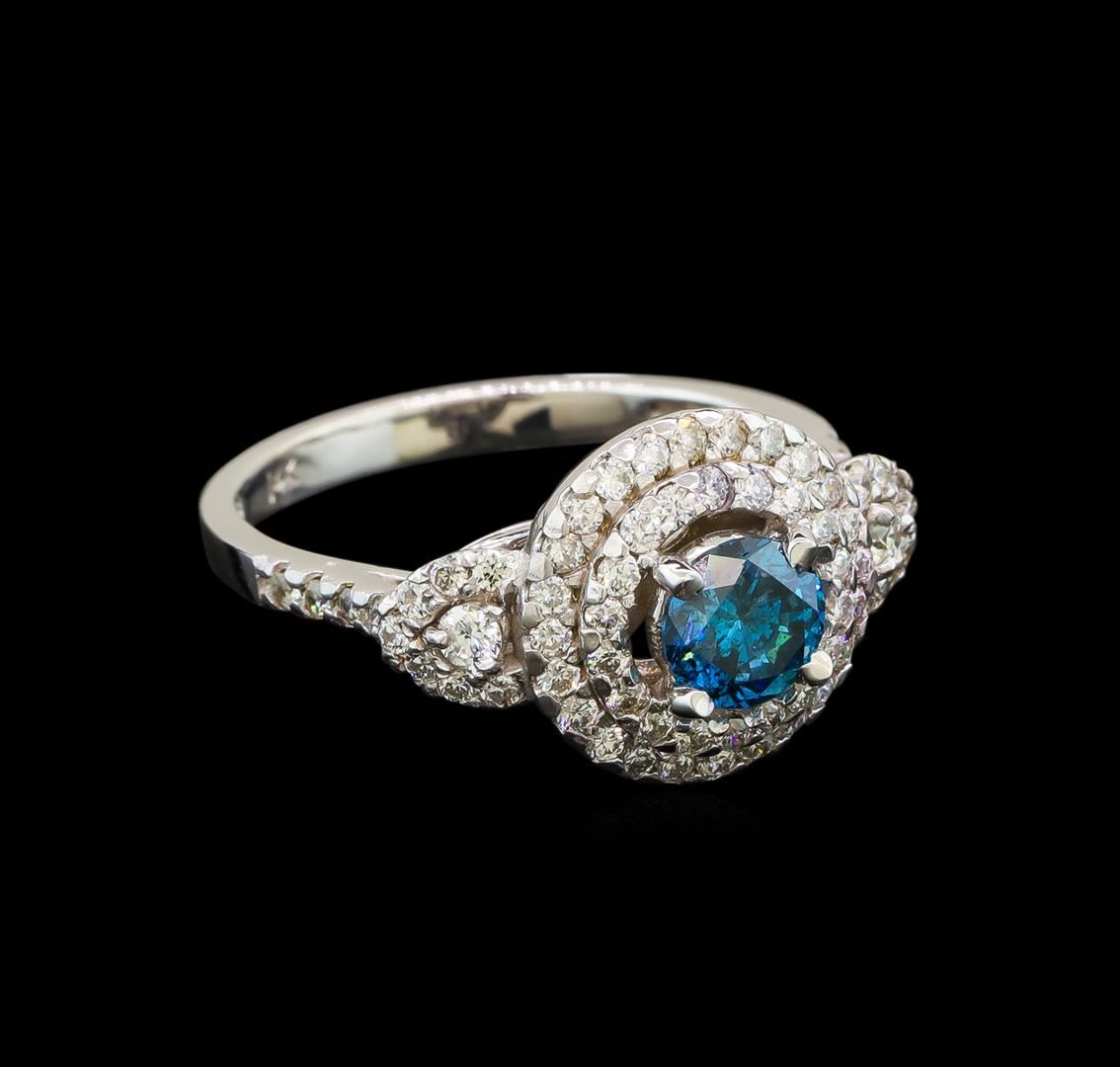 One electronically tested 14KT white gold ladies cast diamond engagement ring with a bright polish finish. Identified with markings of "14K". Condition is new. Containing: One prong set round brilliant cut diamond, measuring 5.40 - 5.40 x 3.24mm (depth est.) approximate weight of 0.58ct. Clarity: I-2, Cut is Good. The color of the stone has been treated. Sixty-Six prong set round brilliant cut diamonds, measuring 1.80 - 1.20 x 0.90mm (depth est.) approximate total weight of 66 Stones = 0.40ct. Clarity: SI-1 to SI-2. Color: H - I, Cut is Good. All diamonds are graded in the mounting, unless otherwise stated. Total Weight of Diamonds 0.98ct. Total Weight of Engagement Ring 3.60 grams. GGL Appraised at $3,760.00.