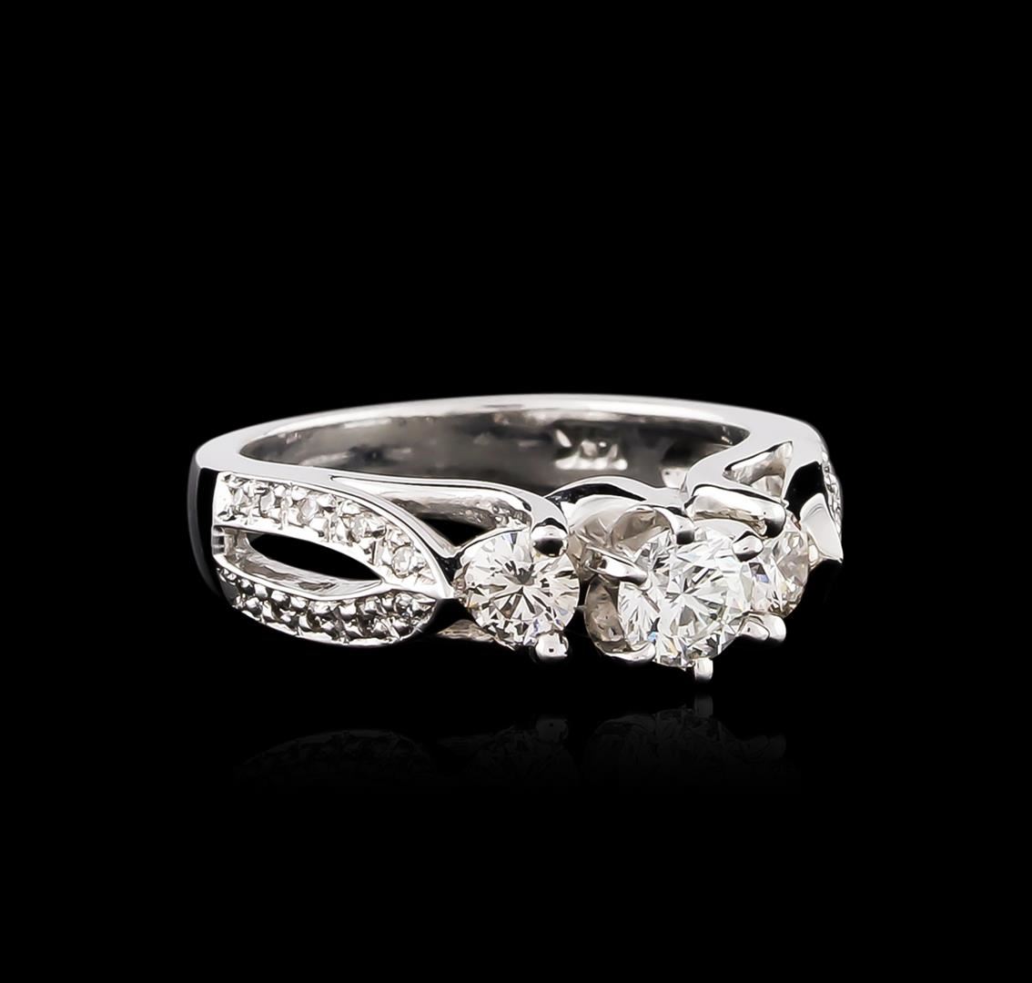 One electronically tested 14KT white gold ladies cast diamond unity ring with a bright polish finish. The featured diamond is accented by a single diamond on either side and supported by diamond set split shoulders, completed by a three millimeter wide band. Identified with markings of "14K". Condition is good. Containing: One prong set round brilliant cut diamond, measuring 4.50 - 4.45 x 2.69mm (depth est.), 8.00.%. GTCF approximate weight of 0.45ct. Graded in the setting. Clarity: SI-2. Color: I. Depth 60.0%. Table 58.0%. Two prong set round brilliant cut diamonds, measuring 3.75 - 3.70 x 2.24mm (depth est.) approximate total weight of 2 Stones = 0.38ct. Graded in the setting. Clarity: VS-1 to VS-2. Color: H - I Twenty bead set round brilliant cut diamonds, measuring 1.20 - 1.10 x 0.69mm (depth est.) approximate total weight of 20 Stones = 0.15ct. Graded in the setting. Clarity: VS-2 to SI-1. Color: G - I. Total Weight of Diamonds 0.98ct. Total Weight of Ring 6.61 grams. AIG Appraised at $5,670.00.