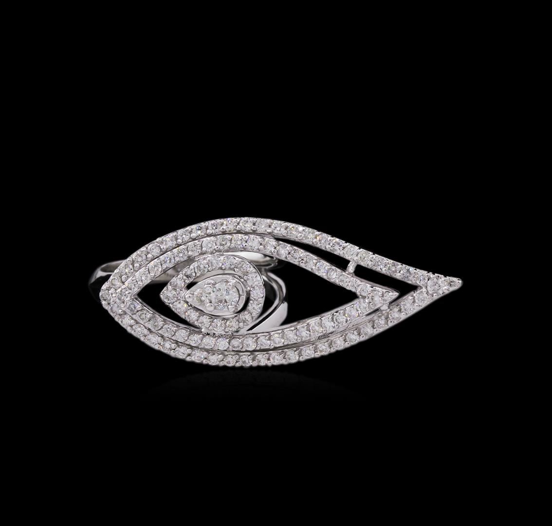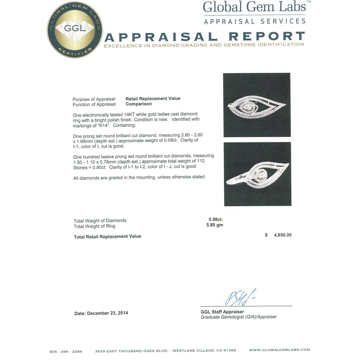 One electronically tested 14KT white gold ladies cast diamond ring with a bright polish finish. Identified with markings of "K14". Condition is new. Containing: One prong set round brilliant cut diamond, measuring 2.80 - 2.80 x 1.68mm (depth est.) approximate weight of 0.08ct. Clarity: I-1. Color: I, Cut is Good. One Hundred Twelve prong set round brilliant cut diamonds, measuring 1.50 - 1.10 x 0.78mm (depth est.) approximate total weight of 112 Stones = 0.90ct. Clarity: I-1 to I-2. Color: I - J, Cut is Good. All diamonds are graded in the mounting, unless otherwise stated. Total Weight of Diamonds 0.98ct. Total Weight of Ring 5.80 grams. GGL Appraised at $4,850.00.