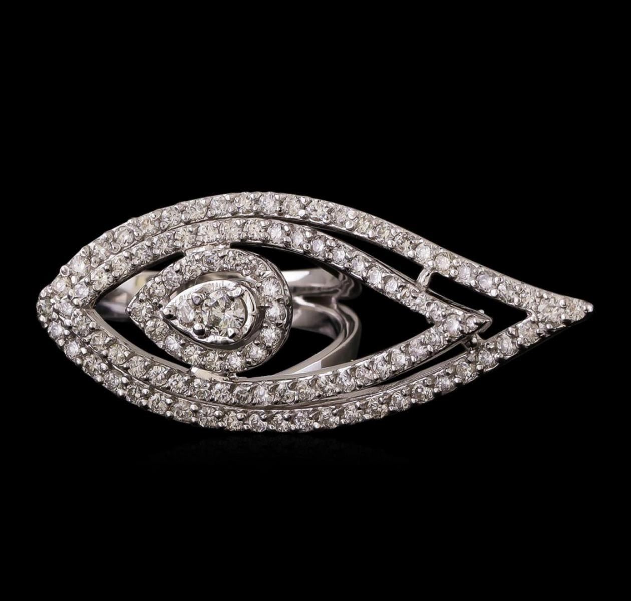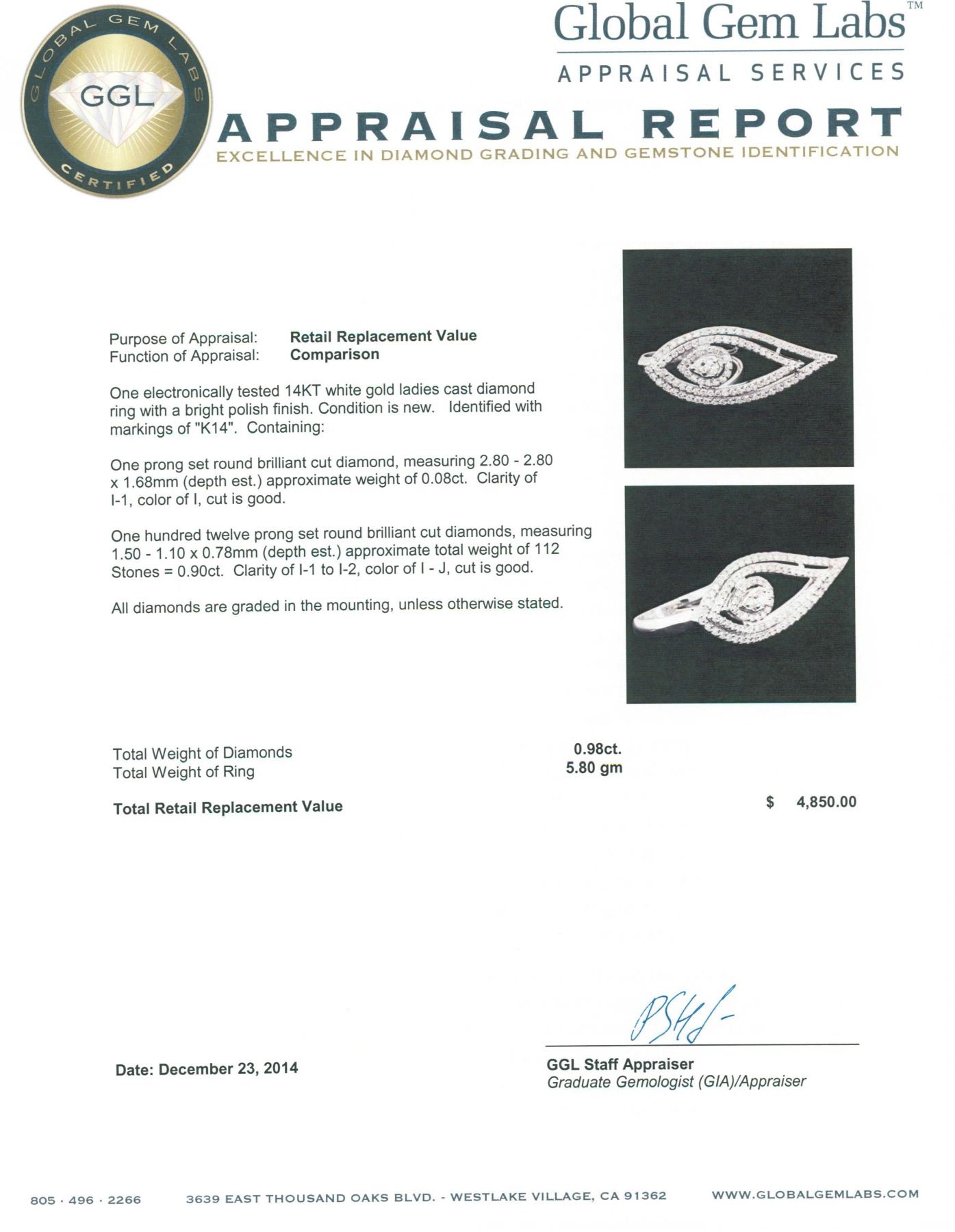 One electronically tested 14KT white gold ladies cast diamond ring with a bright polish finish. Identified with markings of "K14". Condition is new. Containing: One prong set round brilliant cut diamond, measuring 2.80 - 2.80 x 1.68mm (depth est.) approximate weight of 0.08ct. Clarity: I-1. Color: I, Cut is Good. One Hundred Twelve prong set round brilliant cut diamonds, measuring 1.50 - 1.10 x 0.78mm (depth est.) approximate total weight of 112 Stones = 0.90 ct. Clarity: I-1 to I-2. Color: I - J, Cut is Good. All diamonds are graded in the mounting, unless otherwise stated. Total Weight of Diamonds 0.98ct. Total Weight of Ring 5.80 grams. GGL Appraised.