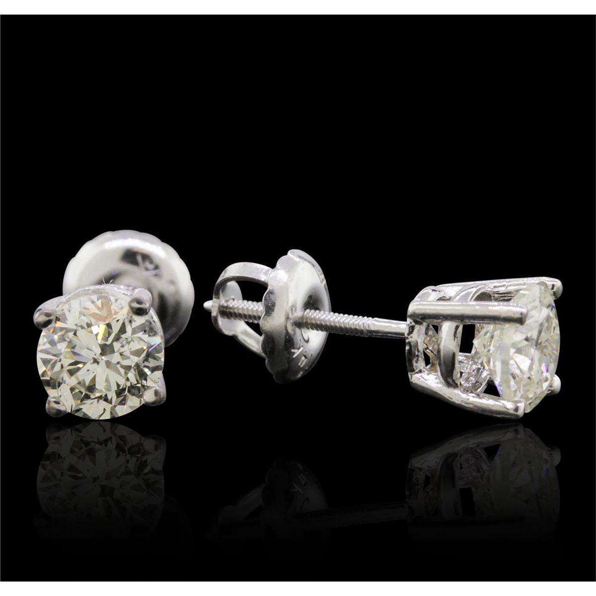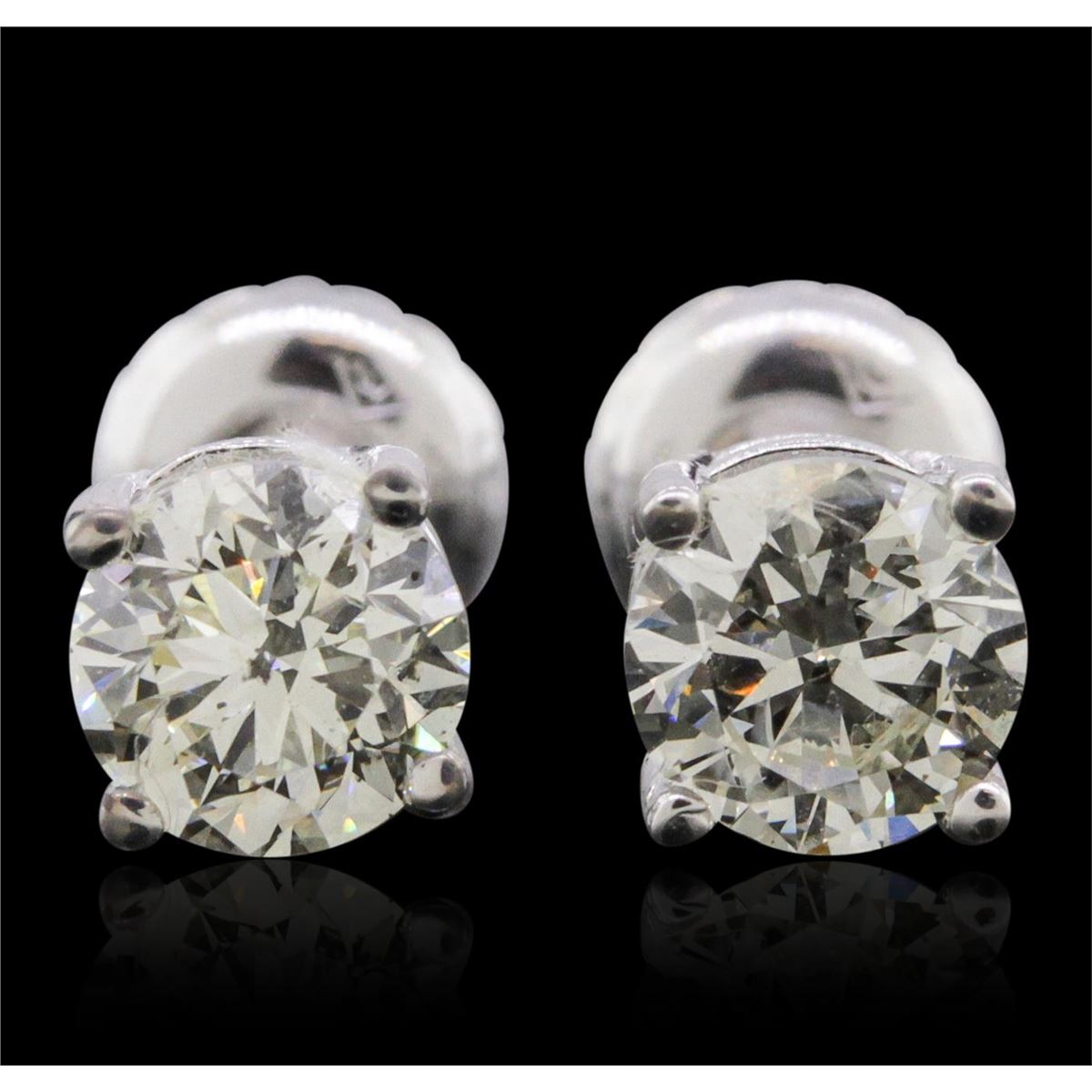 One pair electronically tested 14KT white gold cast & assembled diamond solitaire earrings with screw backs. Condition is new, good workmanship. Containing: One prong set round brilliant cut diamond, measuring 5.00 - 4.90 x 3.00mm (depth est.), 8.00% GTCF approximate weight of 0.48ct. Graded in the setting. Clarity: I-1. Color: 60.6%. Table 60.8%. One prong set round brilliant cut diamond, measuring 4.90 - 4.88 x 3.20mm (depth est.), 5.00% GTCF approximate weight of 0.50ct with a strong blue fluorescence. Graded in the setting. Clarity: SI-2. Color: 65.4%. Table 61.4%. Total Weight of Diamonds 0.98ct. Total Weight of Earrings 1.01 grams. AIG Appraised at $3,300.00.