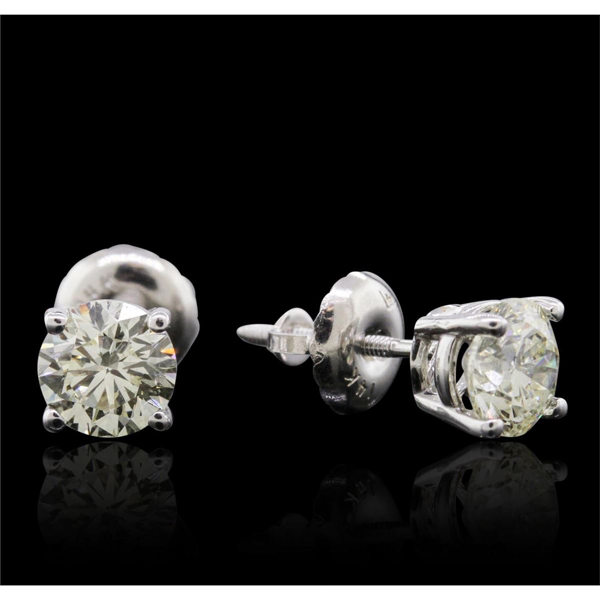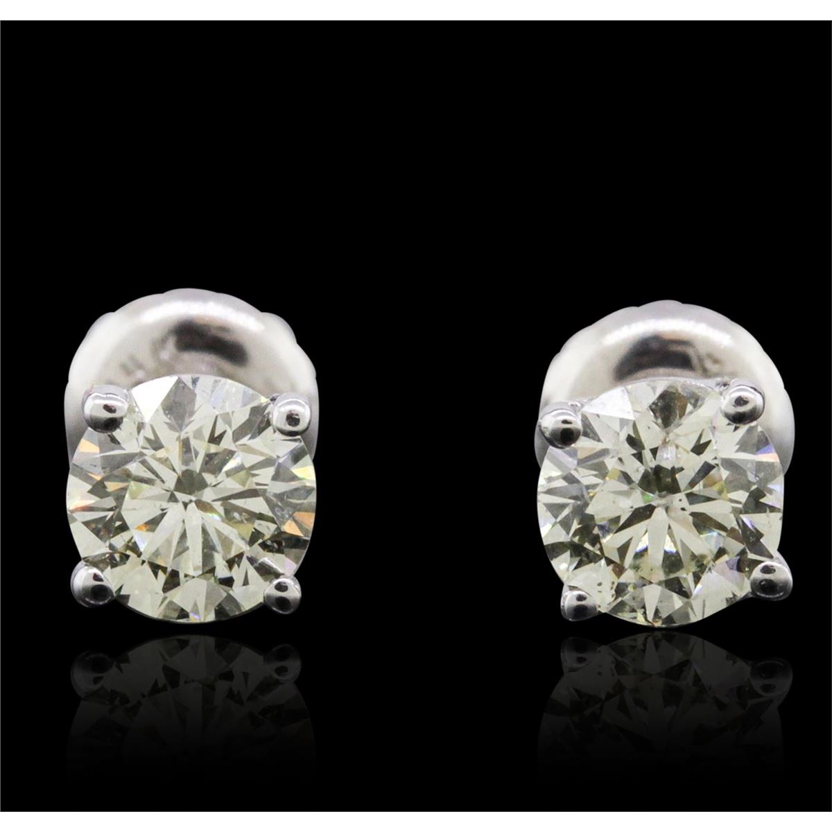 One pair electronically tested 14KT white gold cast & assembled diamond solitaire earrings with screw backs. Condition is new, good workmanship. Containing: One prong set round brilliant cut diamond, measuring 5.00 - 5.00 x 3.20mm (depth est.) approximate weight of 0.50ct. Graded in the setting. Clarity: SI-2. Color: M. Depth 64.0%. Table 57.0%. One prong set round brilliant cut diamond, measuring 5.00 - 5.00 x 3.03mm (depth est.), 2.00% GTCF approximate weight of 0.48ct. Graded in the setting. Clarity: I-1. Color: 60.6%. Table 56.0%. Total Weight of Diamonds 0.98ct. Total Weight of Earrings 0.95 grams. AIG Appraised at $2,900.00.